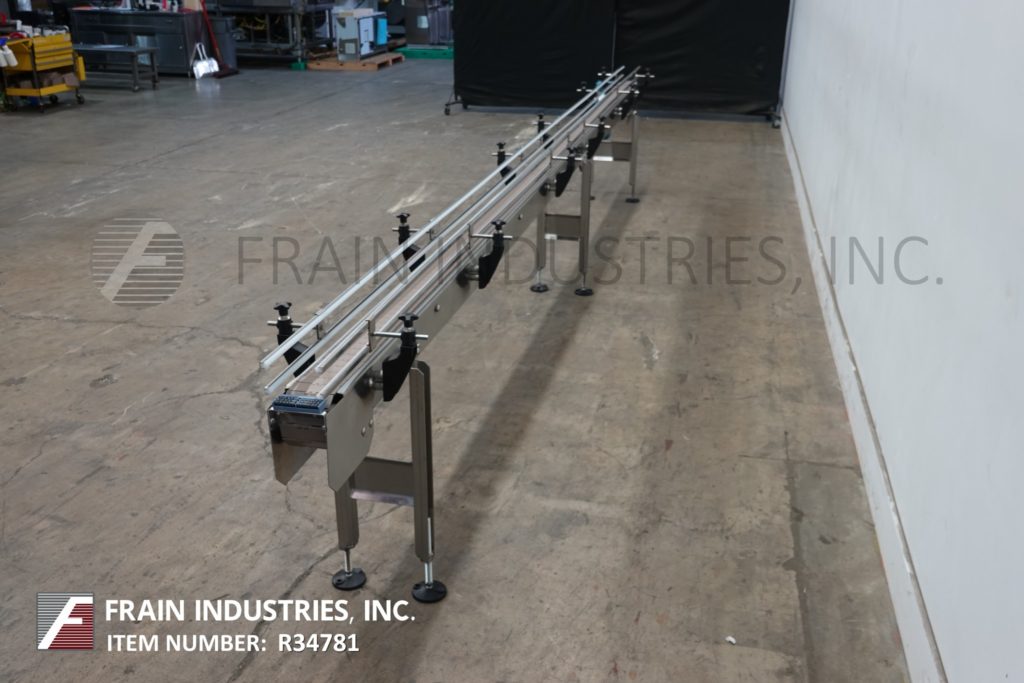 BMI不锈钢框架带式输送机。配备4½“宽X 233”长达Delrin台式产品传送带,可调节导轨,具有31英寸至37英寸,进料和排放高度范围。安装在(4)腿不锈钢腿框架上,带水平垫。