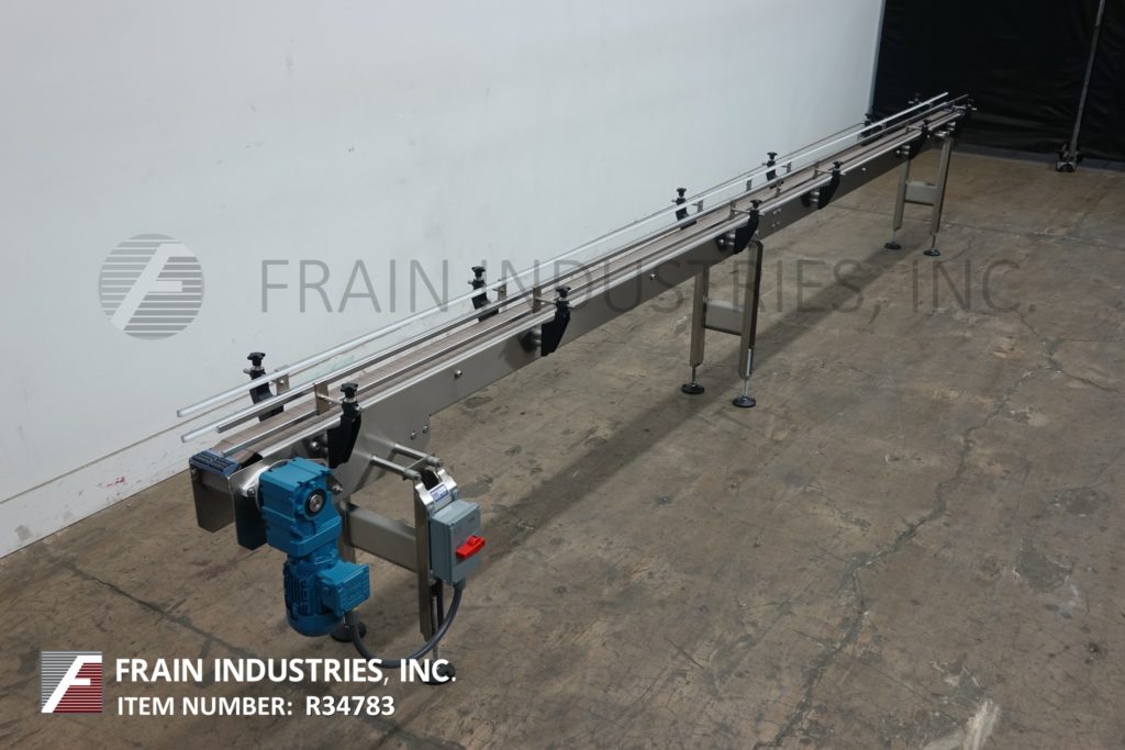 BMI不锈钢框架带式输送机。配备4½“宽x 233”长Delrin桌面产品输送带,可调节导轨和有31“到37”的饲料和排放高度范围。安装在带有调平垫的(4)支腿不锈钢支架上。