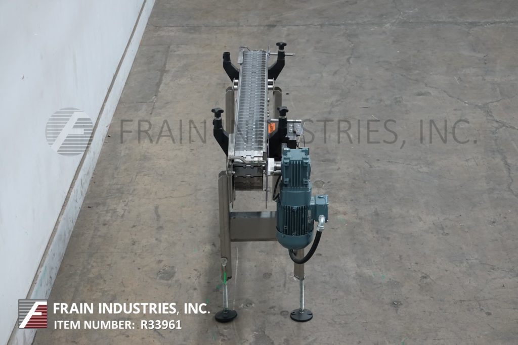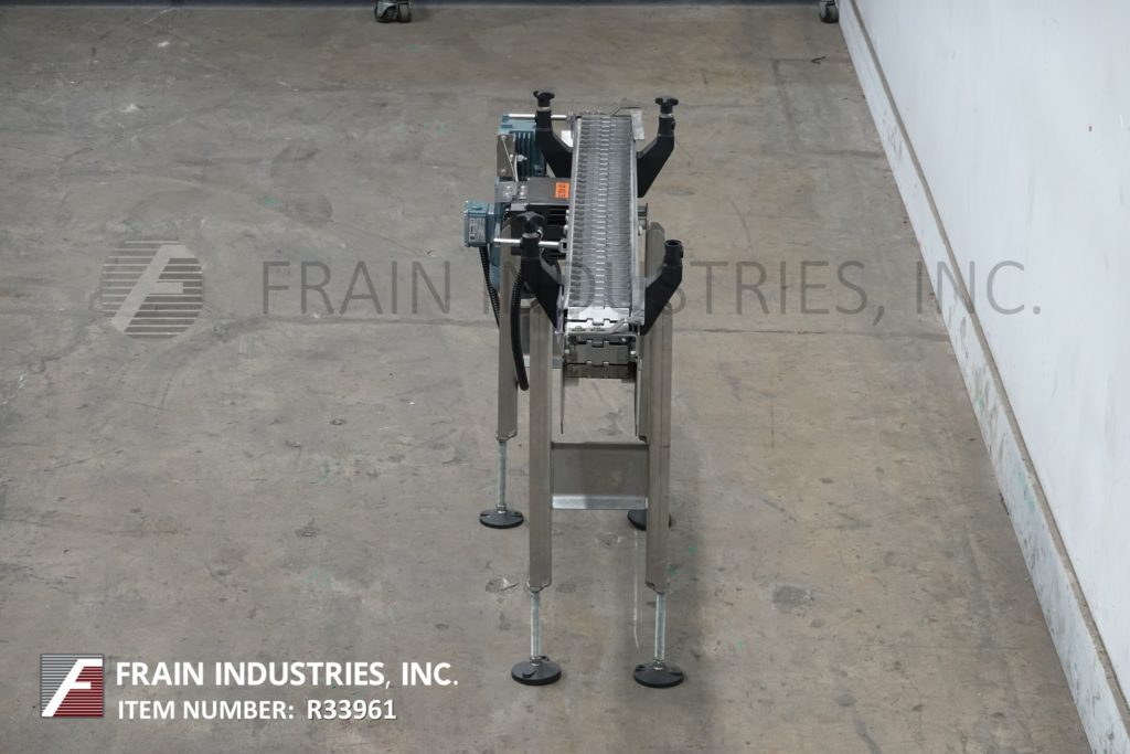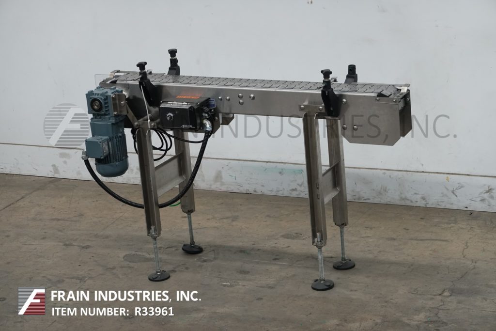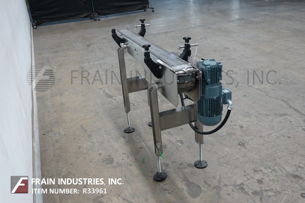 BMI不锈钢框架带式输送机。配备变速控制器,4½“宽× 56”长不锈钢台面产品输送带,可调节导轨,有31“至37”的进料和出料高度范围。安装在(4)腿的不锈钢腿架与水平垫。