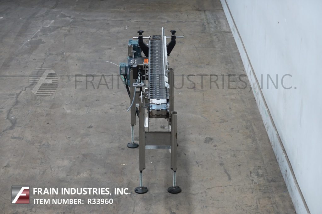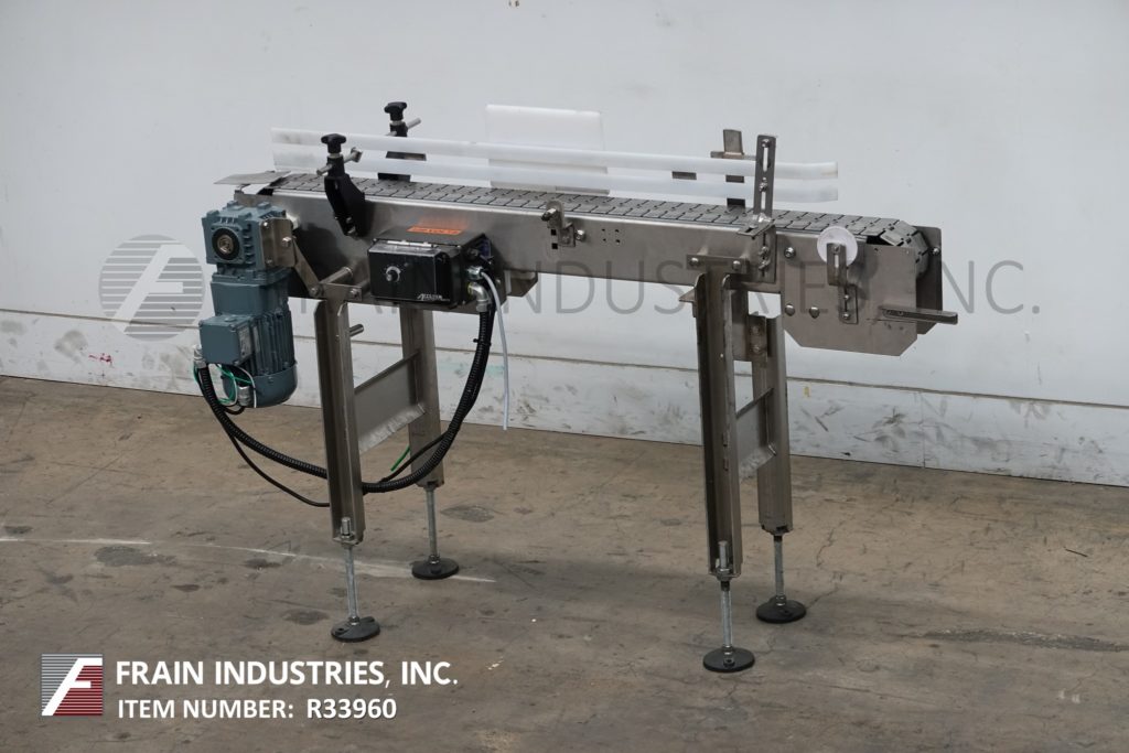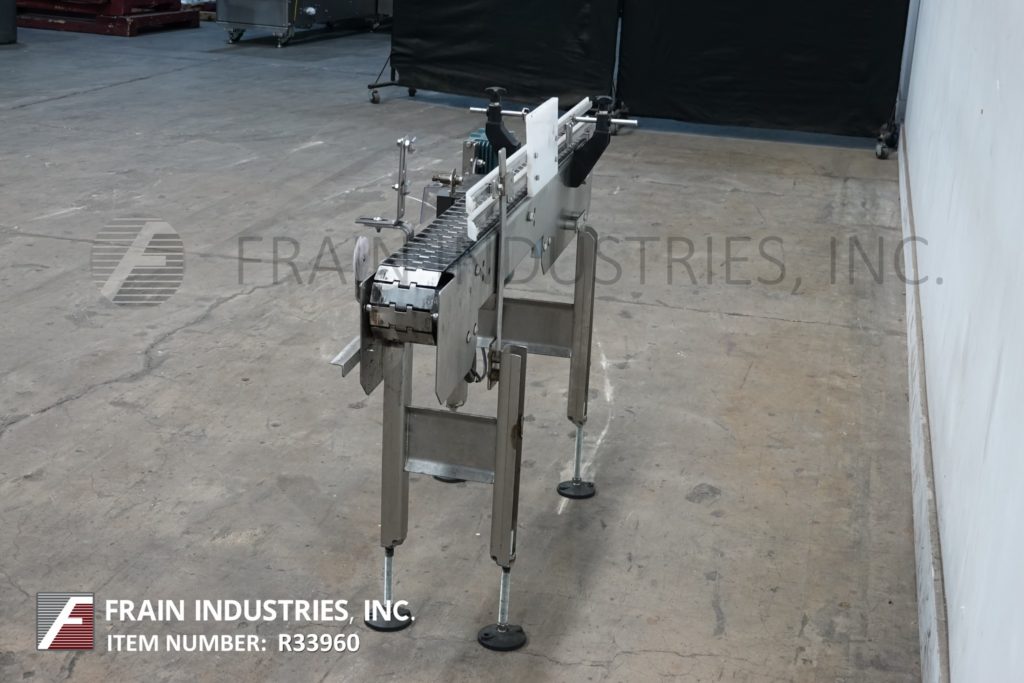 BMI不锈钢框架带式输送机。配备变速控制器,4½“宽x 56”长不锈钢台面产品输送带,可调节滑道,在进料和出料高度范围31“至37”。(4)支腿安装在不锈钢支腿框架上,配有调平垫。