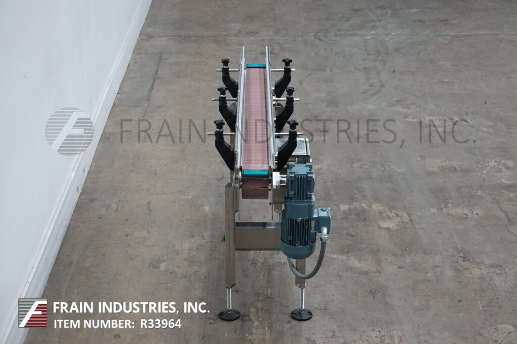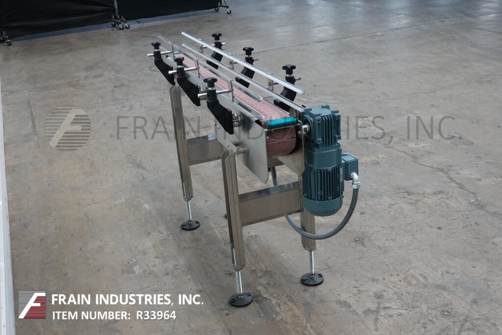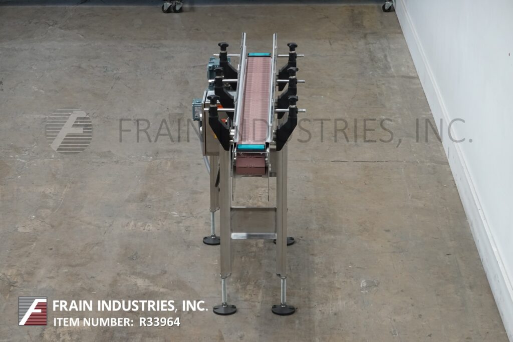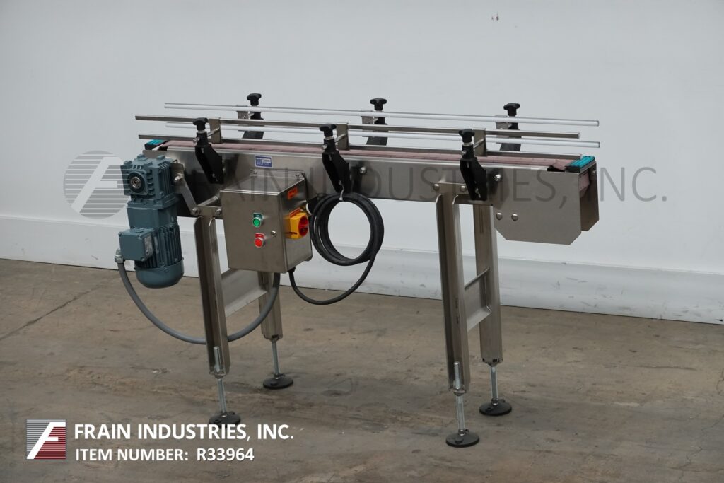 Back to All EquipmentBMI stainless steel frame belt conveyor. Equipped with variable speed controler, 4½" wide x 56" long stainless steel table top product conveyor belt, adjustable guide rails and has 31" to 37" in feed and discharge height range. Mounted on (4) leg stainless steel leg frame with leveling pads.