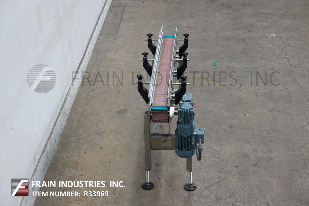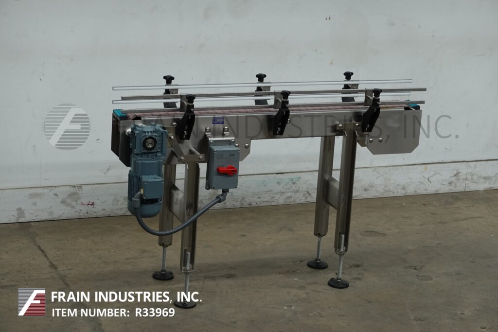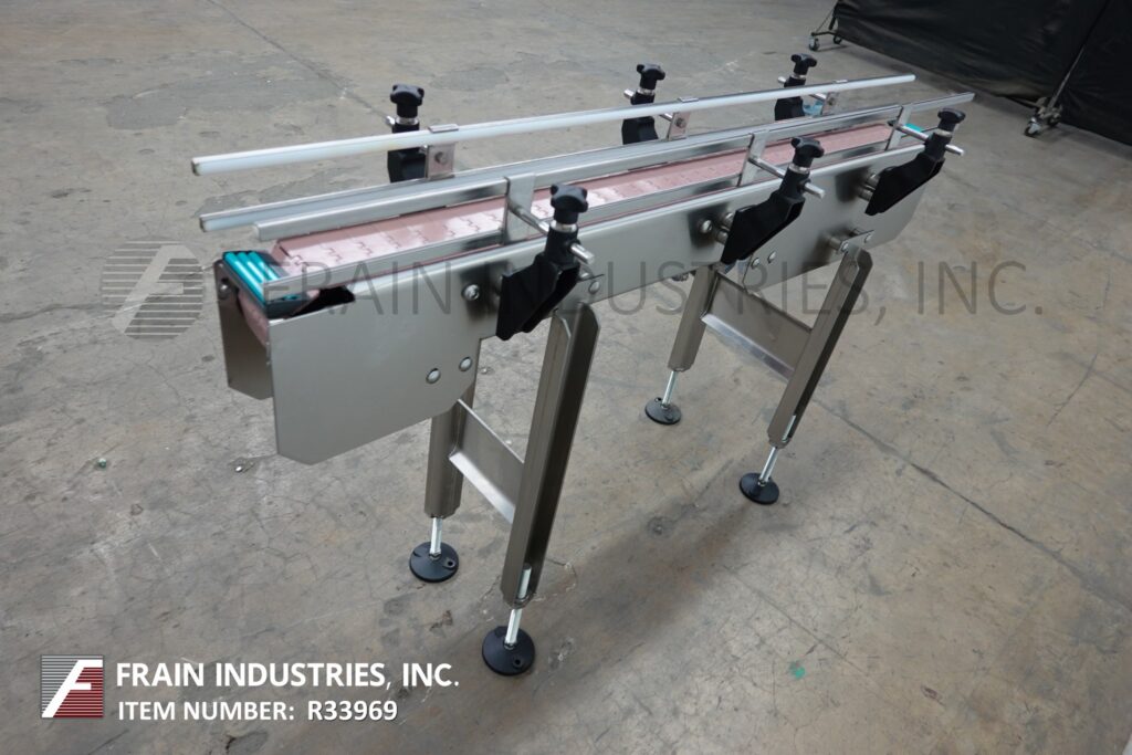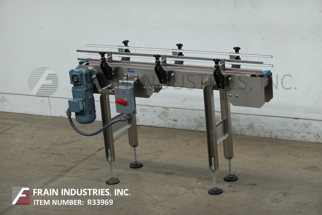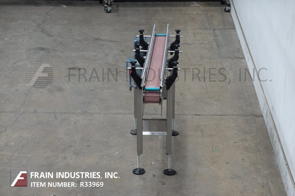 BMI stainless steel frame belt conveyor. Equipped with variable speed controler, 4½" wide x 56" long stainless steel table top product conveyor belt, adjustable guide rails and has 31" to 37" in feed and discharge height range. Mounted on (4) leg stainless steel leg frame with leveling pads.