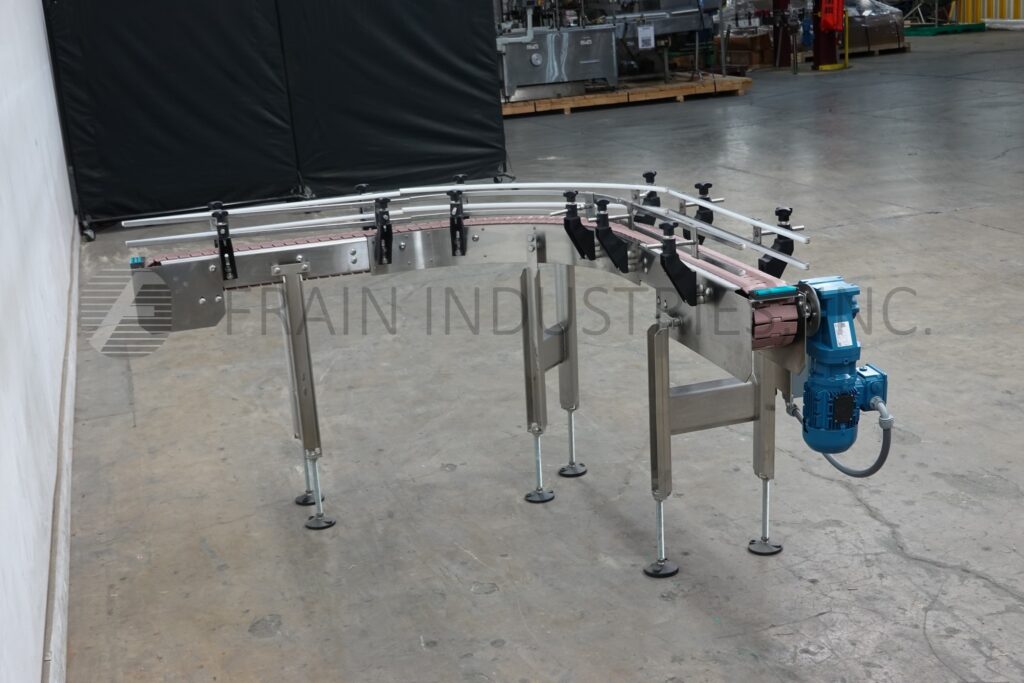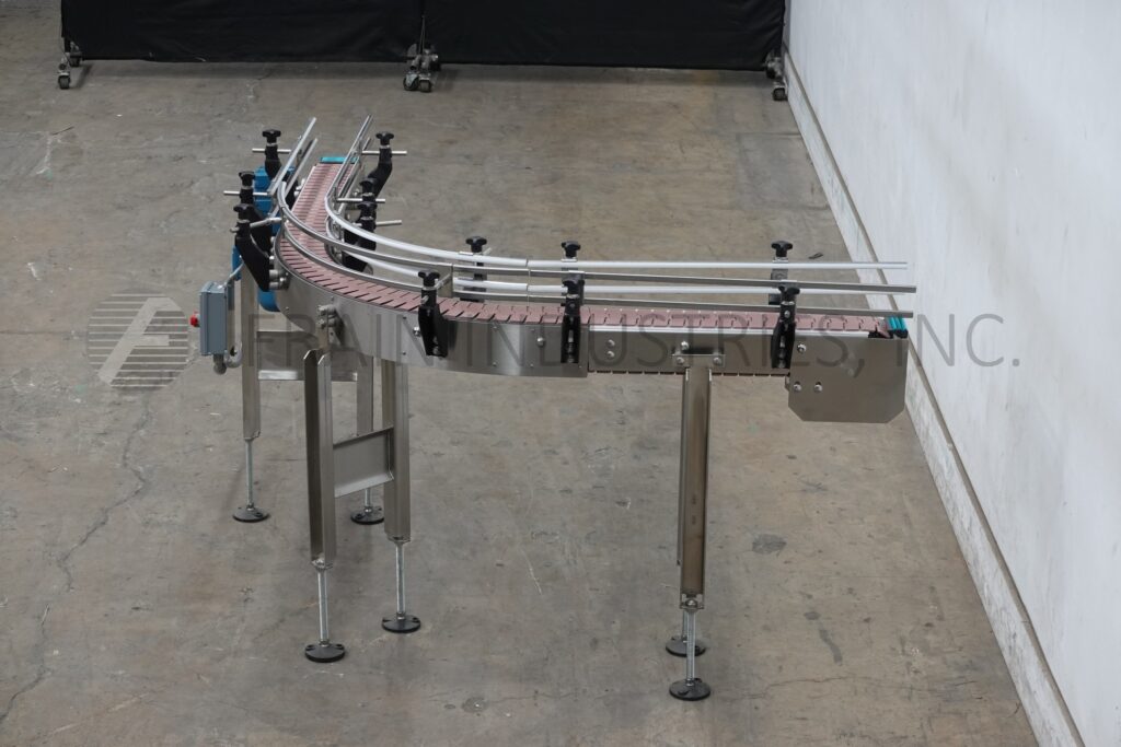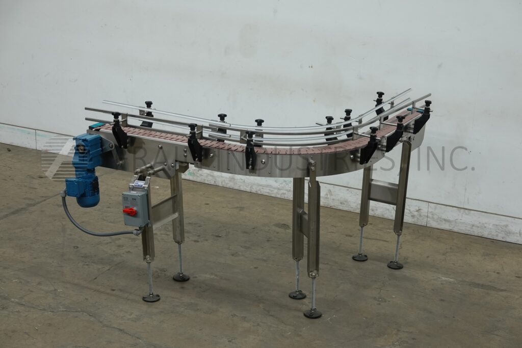 Back to All EquipmentBMI, 90° 4½" wide x 105" long, stainless steel conveyor. Equipped with a 48" long infeed to 90° turn to a 48" long discharge with a 30" to 37" infeed / discharge height. Powered by a ½ hp drive.