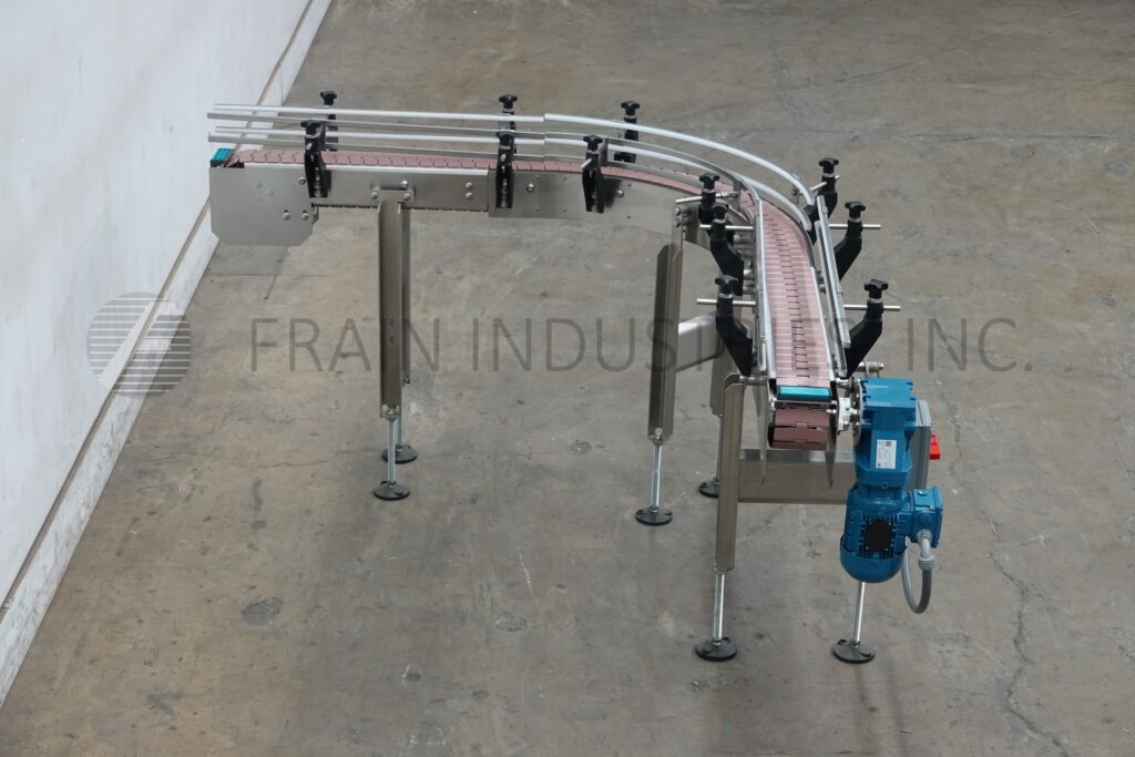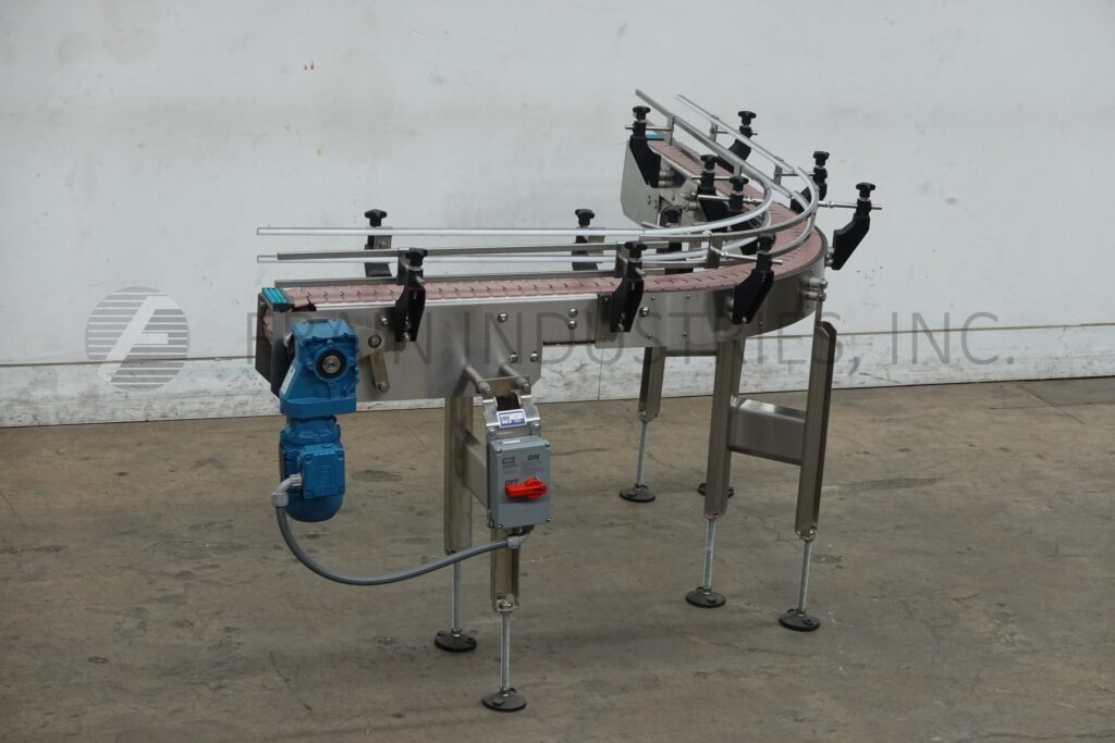 Back to All EquipmentBMI, 90° 4½" wide x 105" long, stainless steel conveyor. Equipped with a 48" long infeed to 90° turn to a 48" long discharge with a 30" to 37" infeed / discharge height. Powered by a ½ hp drive.