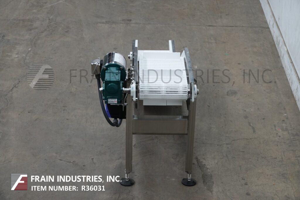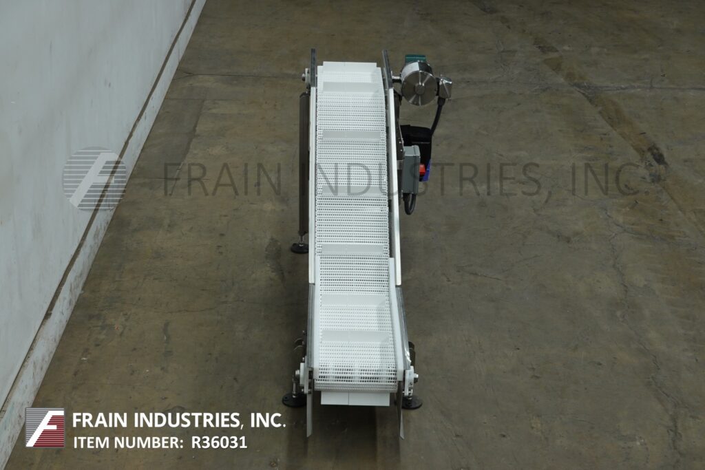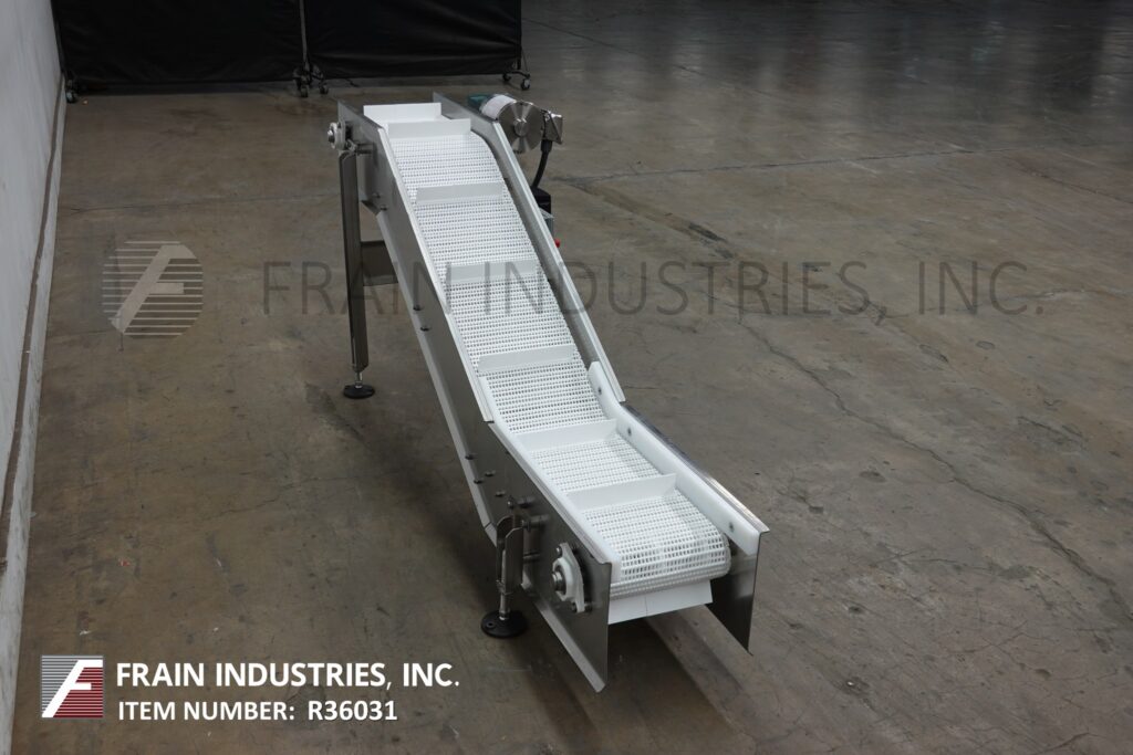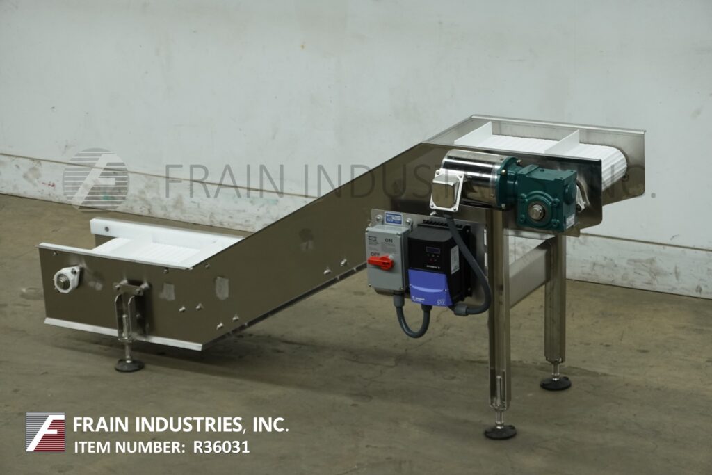 Back to All EquipmentBMI / Benda MFG, stainless steel, inclined cleated conveyor. Equipped with 12" to 15" infeed height, 12" wide conveyor belt with 2" high cleats set on 12" centers. Conveyor has 22" long bottom horizontal run, 41" long incline, 20" long top horizontal run with 33" to 36" discharge range. Powered by ½ Hp motor drive with variable speed. Mounted on stainless steel multi-leg frame with leveling legs.