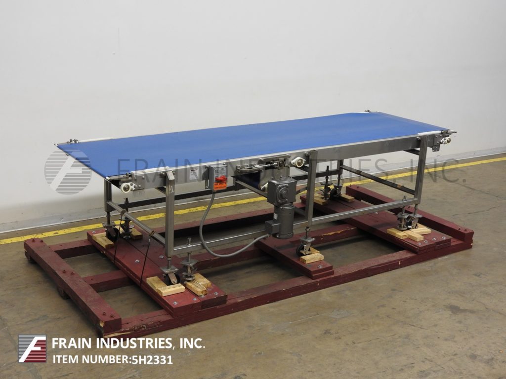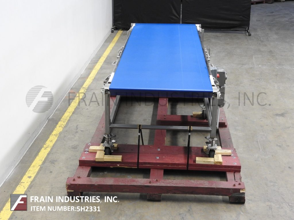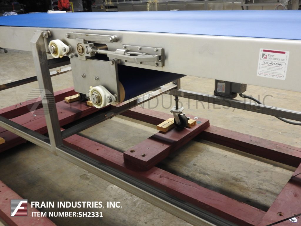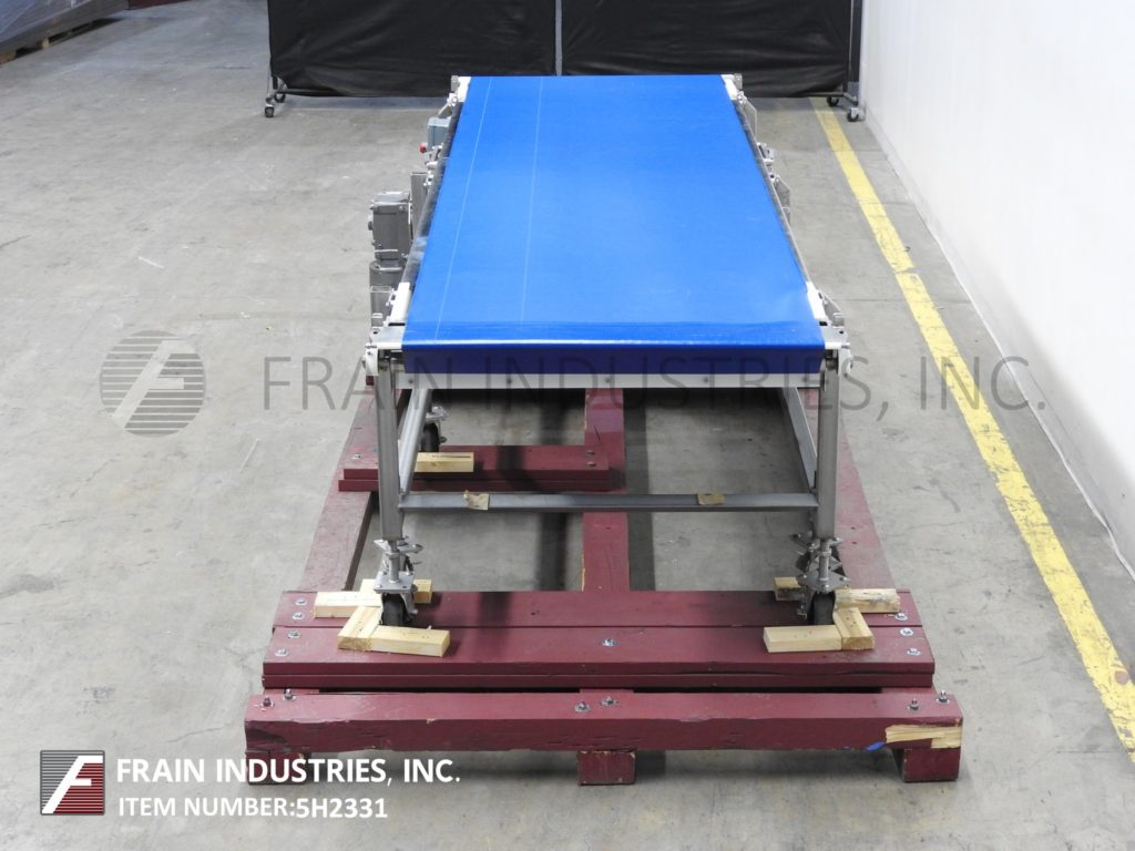 BMI,型号5030,39¼"宽x 145"长,不锈钢带式输送机。配备39¼“宽x 145”长的蓝色食品级皮带,1马力驱动,安装在(6)腿与锁定脚轮和进料/放电范围32“至40”。