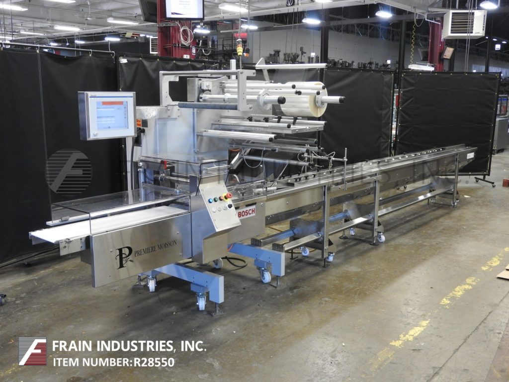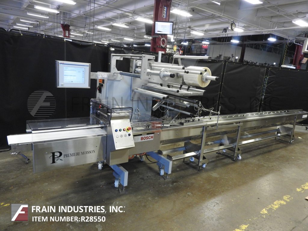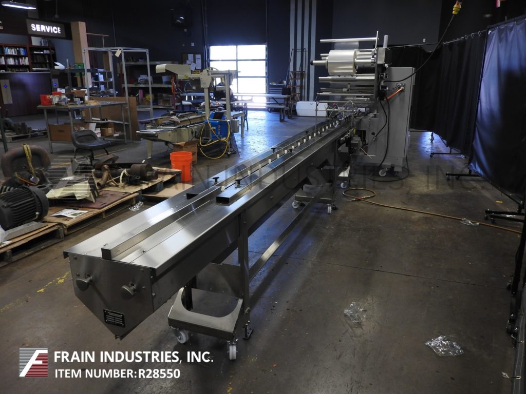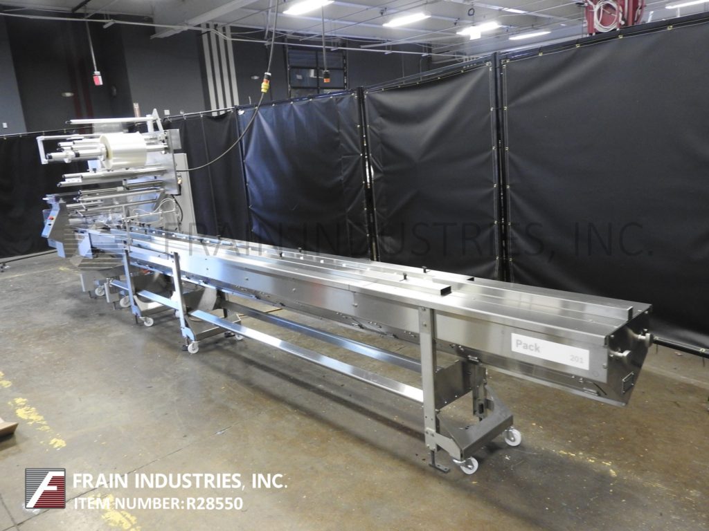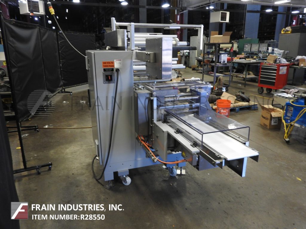 Back to All EquipmentDoboy Model 201, horizontal, 2-up, continous motion wrapper rated from 50 to 150 packages per minute – depending on materials, application and machine configuration. Product size range: 1-1/2" to 22.2" in Length; 1/2" to 9.8" in Width; up to 3.5" in Height with proper change parts. Equipped with 12′ long lugged product infeed with adjustable width guide rails, horizontal hot seal jaws and fin seal wheels, film registration, 24" long discharge chute with safety guarding. Web specifications: up to 26" in width; up to 16" in diameter; 3" core diameter. Dual film spindles with splicing table for ease of film roll change. Control panel has touchpad controls with LCD display operator interface. Mounted on height adjustable legs with casters and leveling legs.