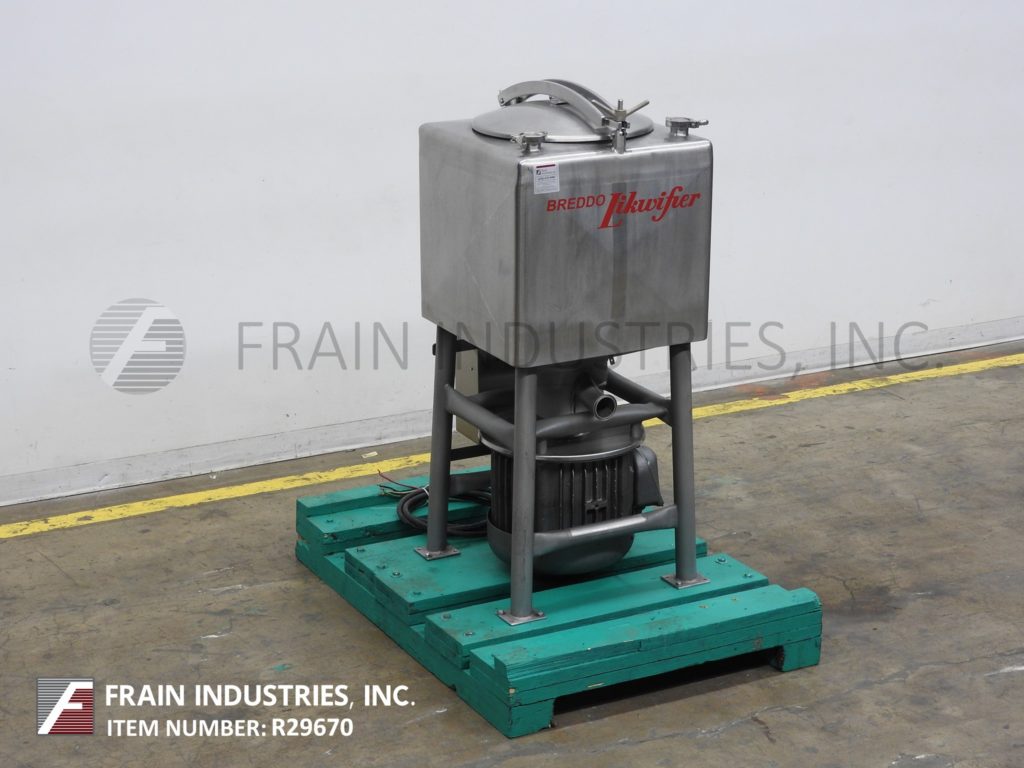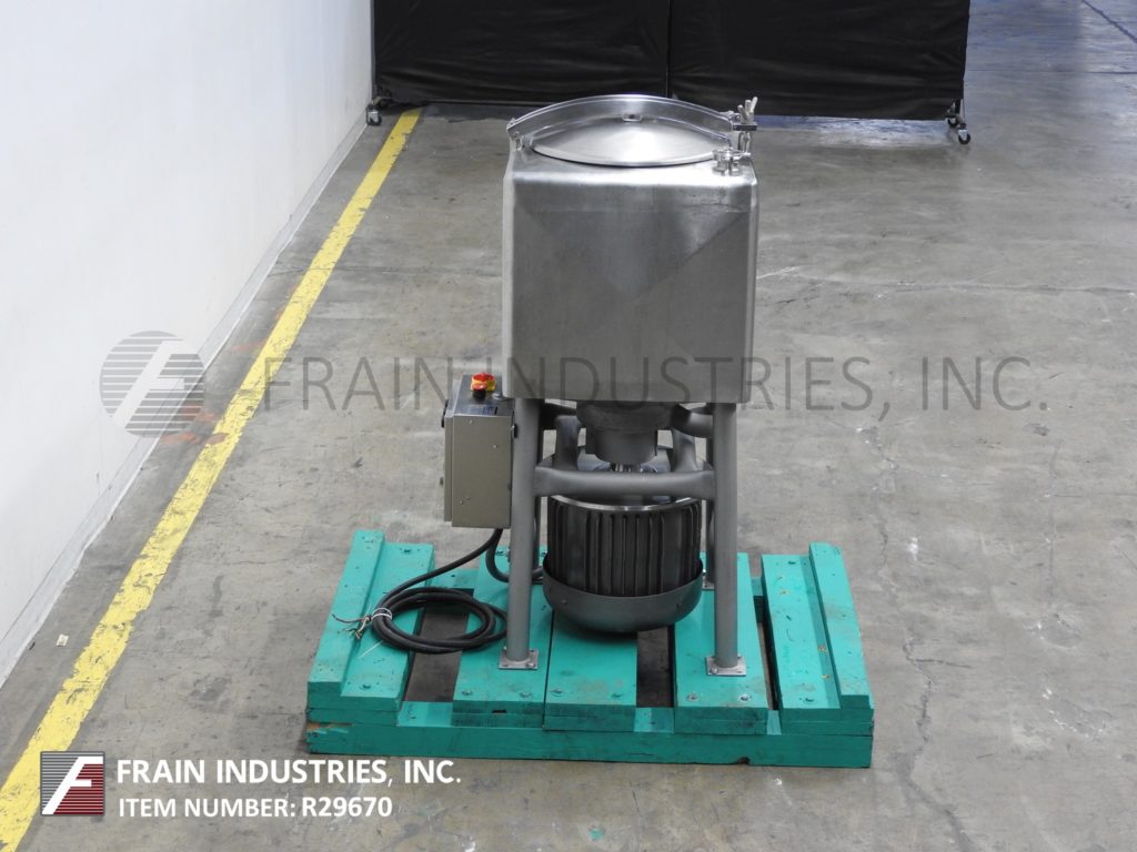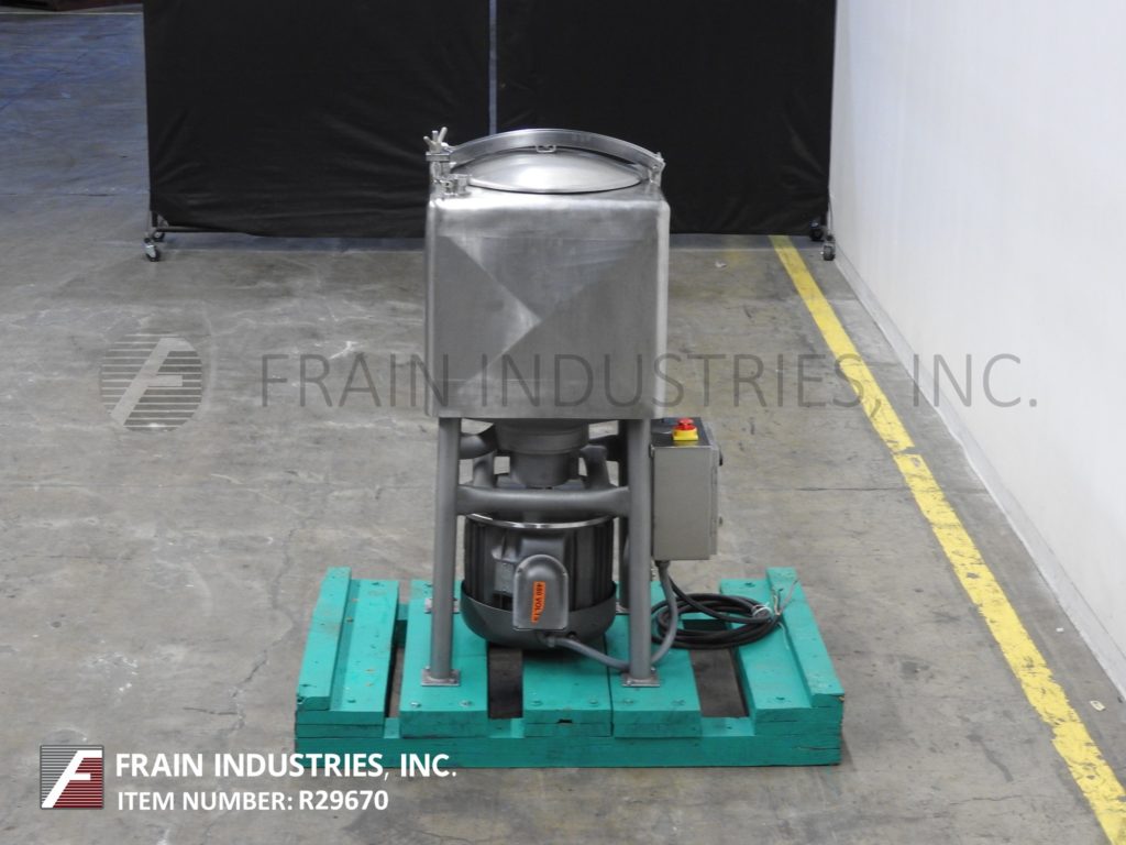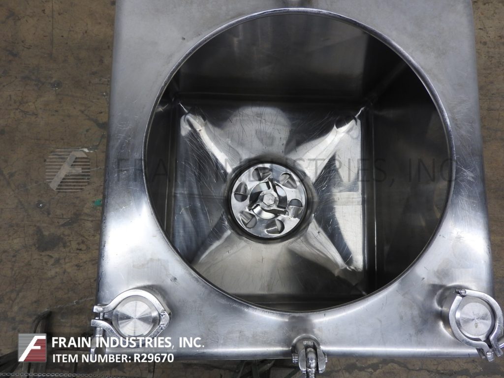返回所有设备Breddo, LDT型,50加仑,304不锈钢,单壁液化器,每小时的产品量-取决于材料和应用。腔体尺寸:25" x 25" x 22"直壁。配备18"直径顶部人方式与翻转螺栓下盖,(2)2½"外径/ 2" ID三卡箍式顶部进口端口,底部6孔/ 3翼通用叶轮底部10马力电机驱动。3”外径/ 2½”ID三钳侧底部放电与28”地面间隙。安装在不锈钢(4)腿管式框架与脚轮。