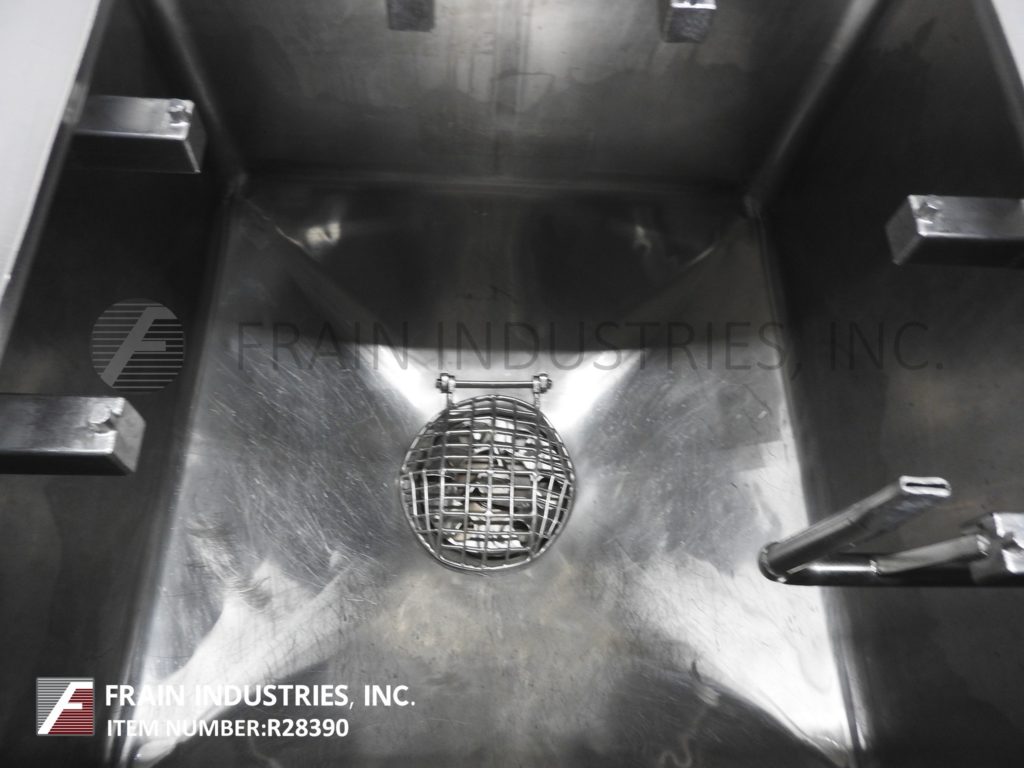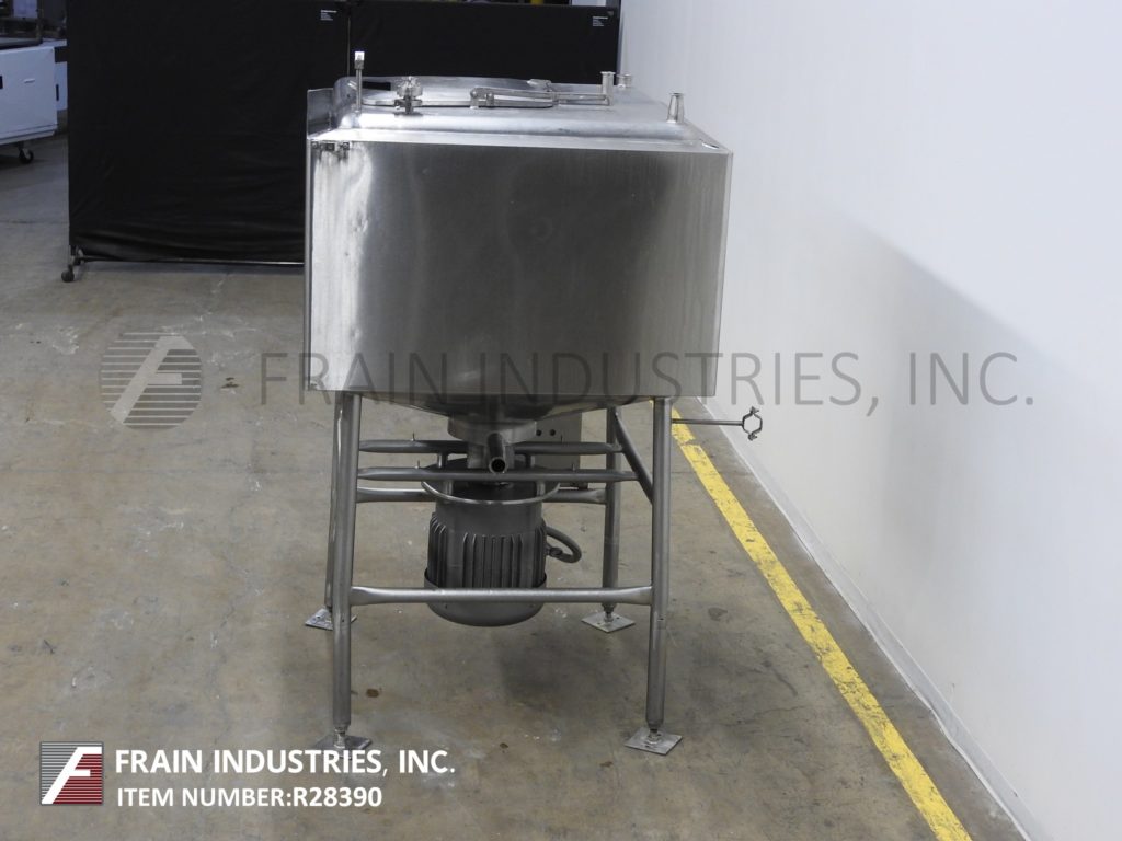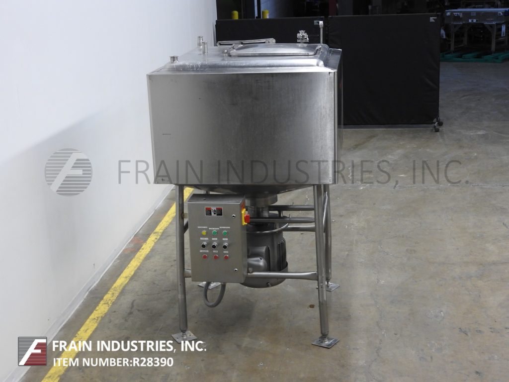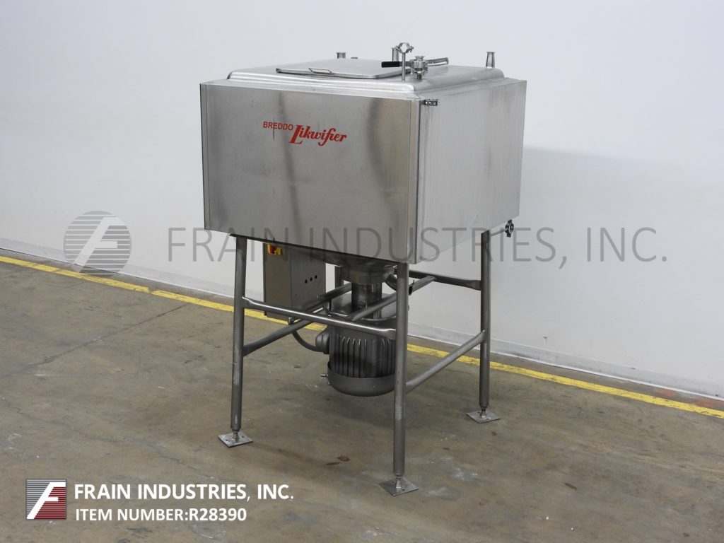 返回所有设备Breddo, LDDW型,250加仑304不锈钢夹套和绝缘液化器。腔体尺寸:45" x 45"带有32"直壁。配备了23“x 23”型男翻转盖,CIP喷淋球由一个2“OD / 1¼”ID Tri-clamp配件、底6孔/ 3翼通用叶轮、2½OD / 2“ID Tri-clamp侧底放电以34”地板间隙和底部两个速度25/12惠普马达驱动。安装在不锈钢(4)腿管状框架上。