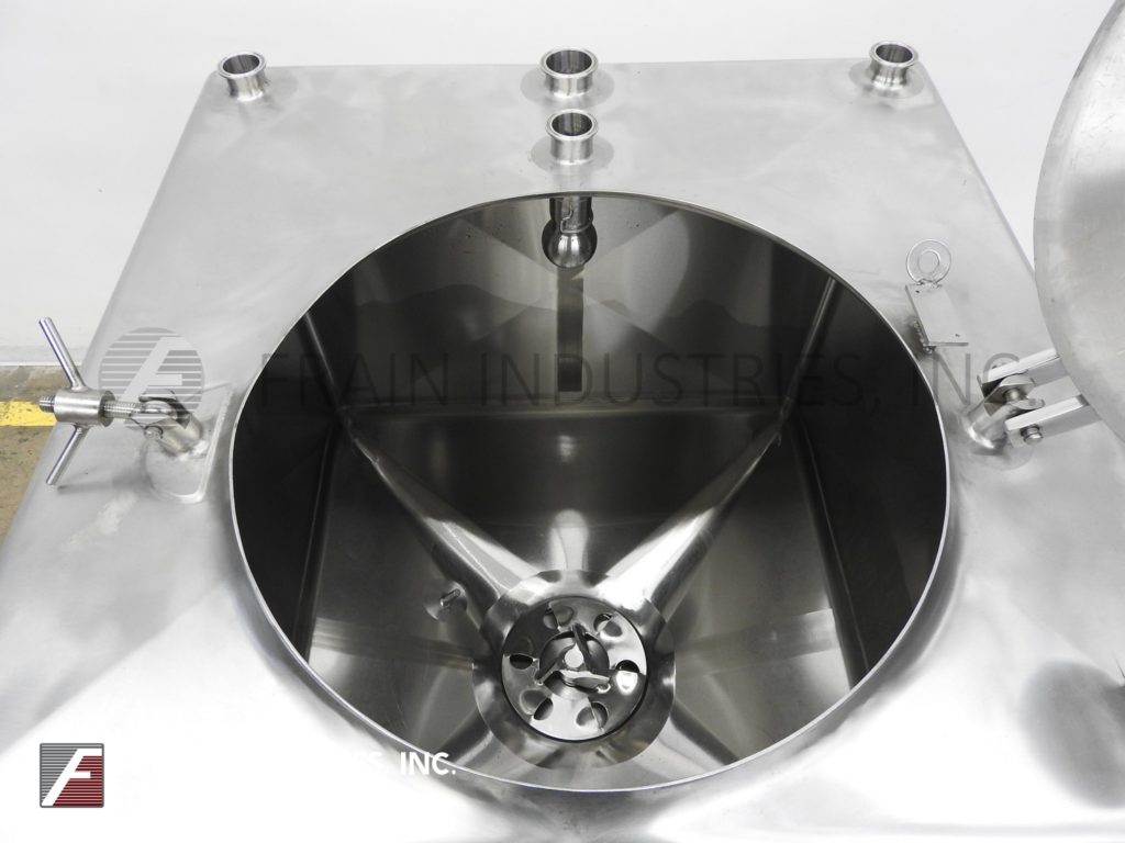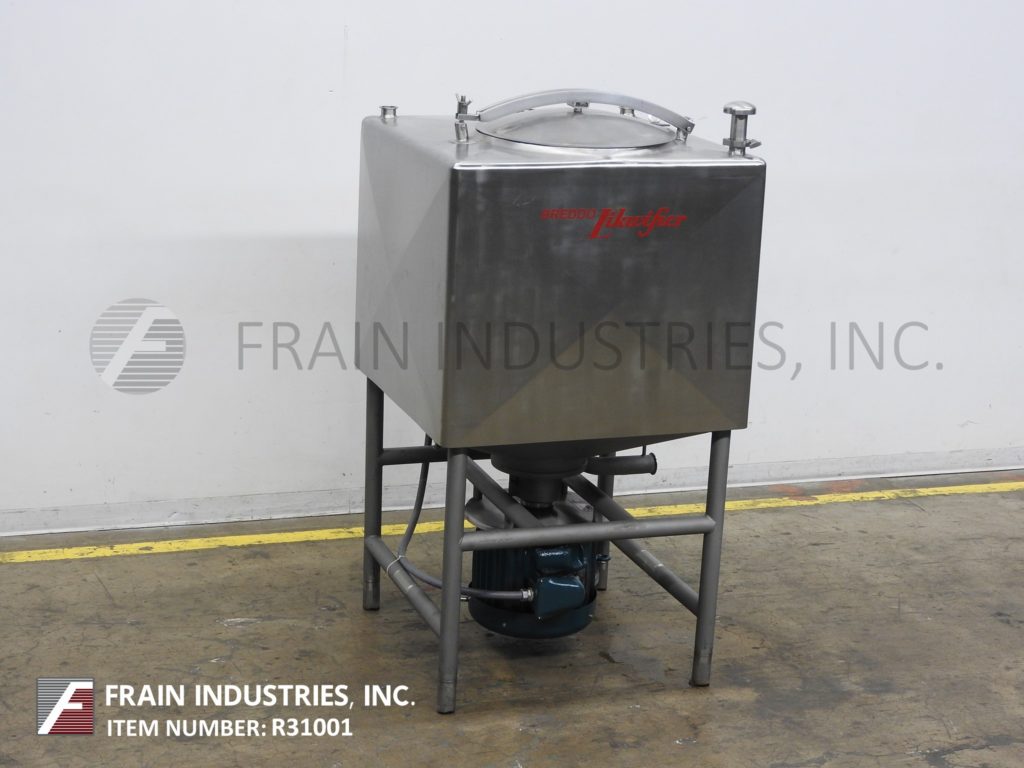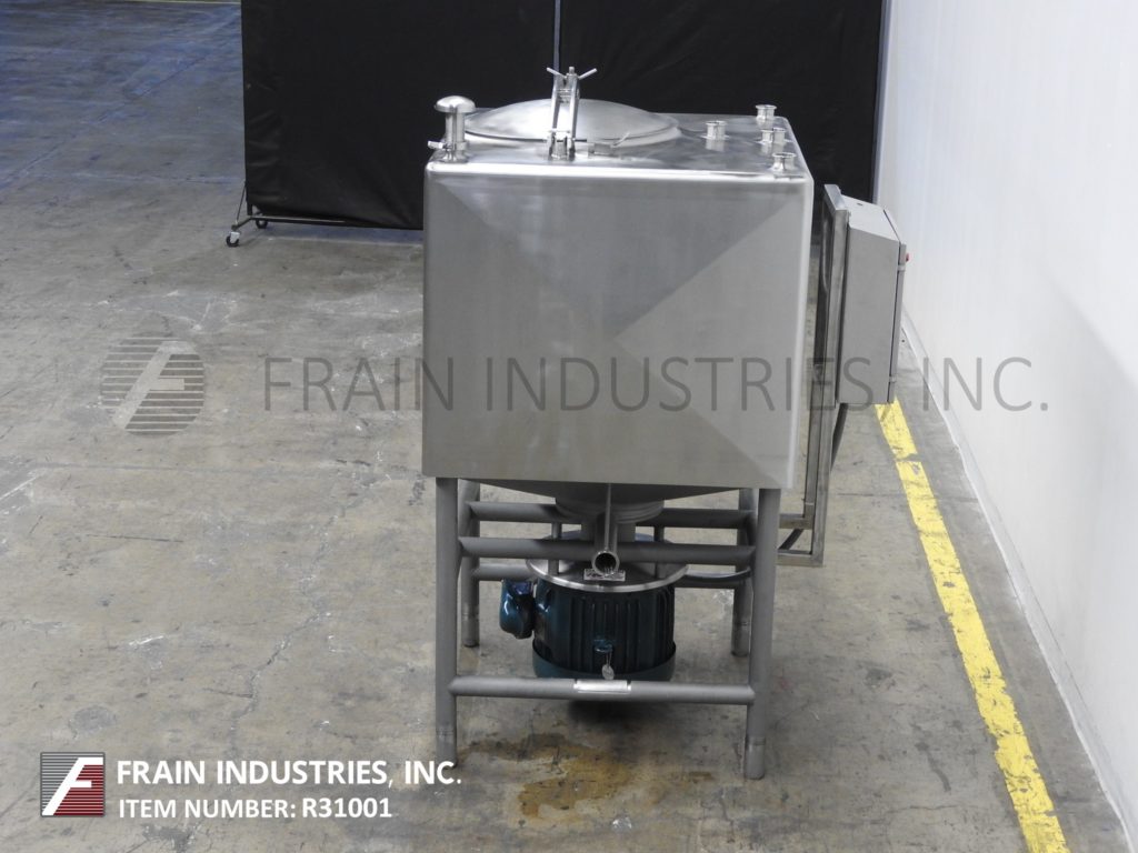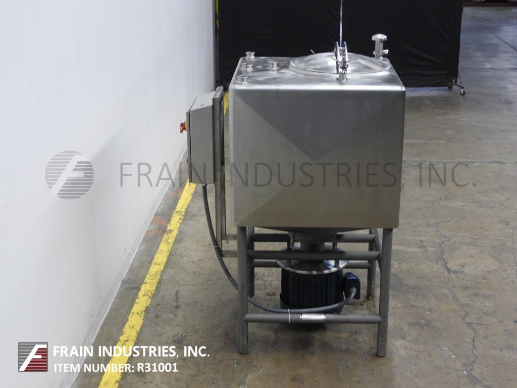 返回所有设备Breddo型液化器,200加仑,不锈钢,高剪切,单壁液化器,每小时产品的数量取决于材料和应用。方形室尺寸:39"长x 39"宽x 32"直壁。平顶有20"外径顶部的人路,可翻转大胆的下盖和(5)2-1/2"外径2" ID卫生顶口,单CIP喷雾球。内底6孔/ 3翼叶轮,25马力直接底部安装电机驱动。锥底有3"外径,2-1/4"内径卫生侧底排放,29"地面间隙。控制面板与启动,停止和e-stop按钮控制。安装在(4)支腿不锈钢框架上。