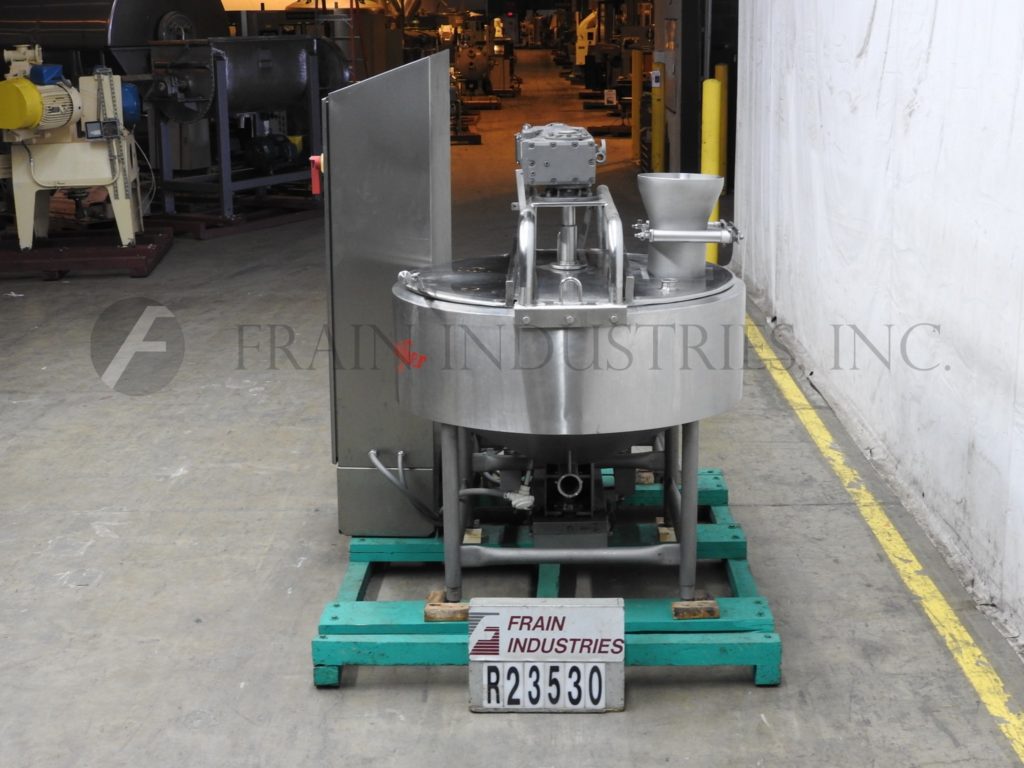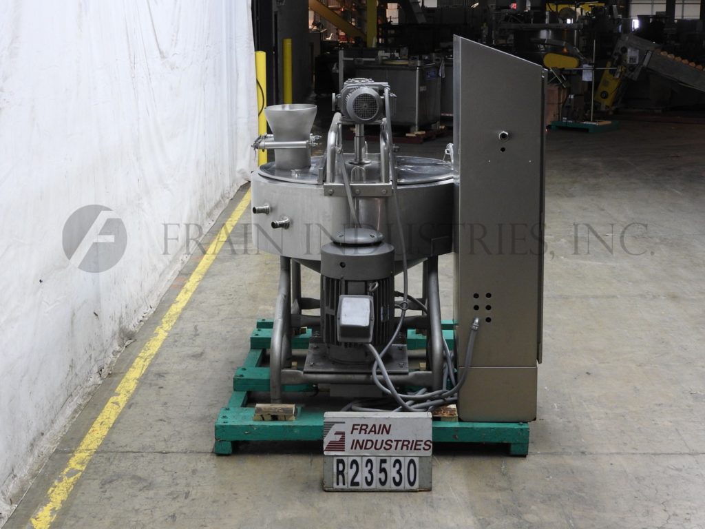 返回所有设备100加仑316L不锈钢夹套液化器,每小时产品量-取决于材料和应用。内部尺寸:48英寸直径x 19英寸直墙x 20英寸长圆锥体。配备铰链顶盖、8-1/2“带气动滑动闸门的产品入口、带底部6孔/3翼叶轮的侧面和底部刮板搅拌装置以及50 Hp侧面底部安装的电机驱动装置。400华氏度时,全套导管架额定压力为125psi,具有1-3/4“入口/出口,锥形底部具有2-3/4”中心底部排放口,蝶阀具有16-1/4”排放高度。安装在(4)支腿底座上。带有VFD和启动、停止、紧急停止控制的控制面板。国家委员会#21333