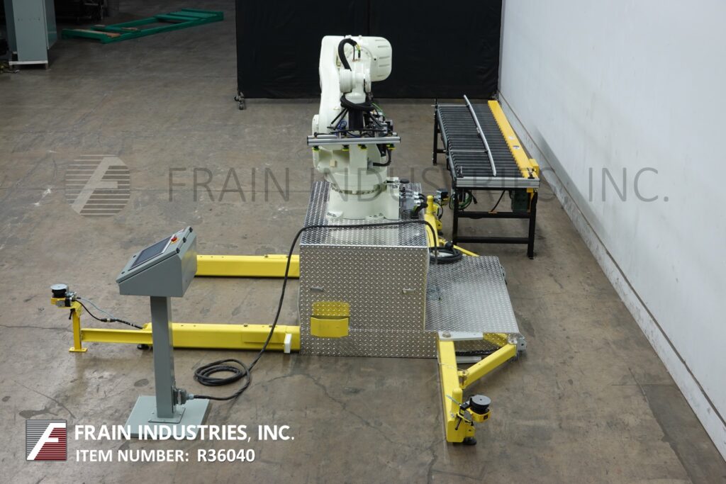 BTB Solutions LLC, Model REAPR, (rapidly employed palletizing system) with 6 axis, articulated, rotary joint, robotic, pic-n-place arm. Rated up to 15 cycles per minute with number of product – depending on materials, application, environment, pattern configuration and type of end effector. The system has a Kawasaki RS080N robot arm with 24" long (4) suction cup end effector and has a stack height up to 79" with a maximum reach of 82" and maximum pick-up weight of 160 lbs. Capable of 3 pallet positions. Product infeed roller conveyor is 22" wide x 118" long with 2" diameter rollers set on 4" centers. Control panel has A/B PLC with A/B HMI panelview with step by step setup. (3) 2D area scanners provide 360 degree safety protection with (2) configurable zones (warning zone – slows the robot’s motion and stop zone – stops all motion). Mounted on heavy duty frame.
