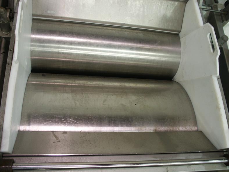 返回所有设备不锈钢冷冻辊磨机。配有(1)36“直径滚轮,带有1 1/2”和7/8“入口/插座和(1)18”直径滚轮,具有7/8“和1”入口/插座,可调节进给尺寸42 1/2“l x(35” - 50“)w。目前设置为43”w。5HP Baldor电机。安装在温和的钢框架上。最后用于冷却焦糖和甘露花操作。
