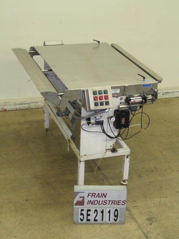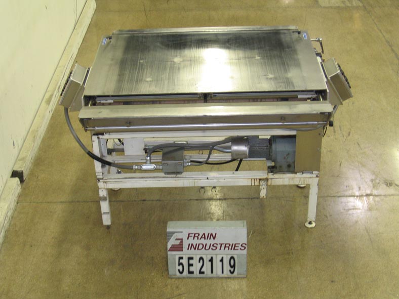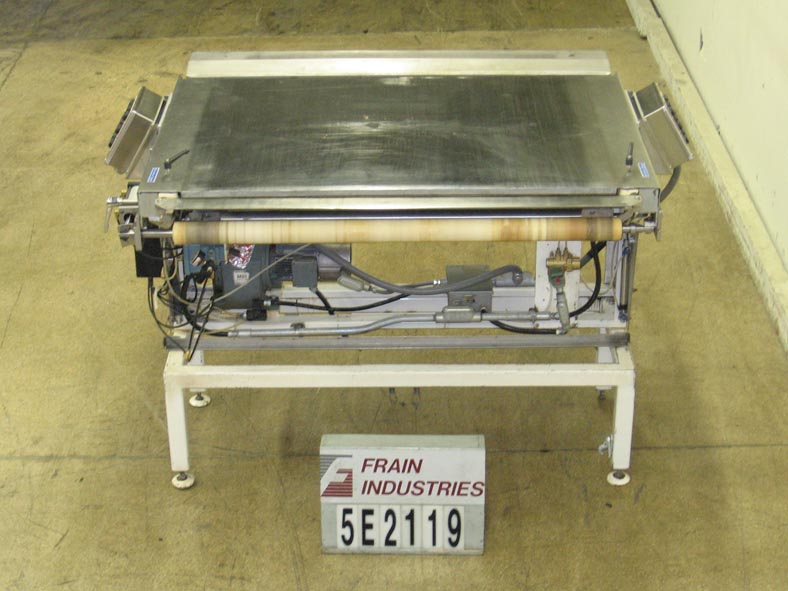 不锈钢,气动切割输送机。配备60英寸宽切割刀片,手动张紧器,40“长×62”宽切割区域,以及操作控制。安装在高度可调节的腿上。