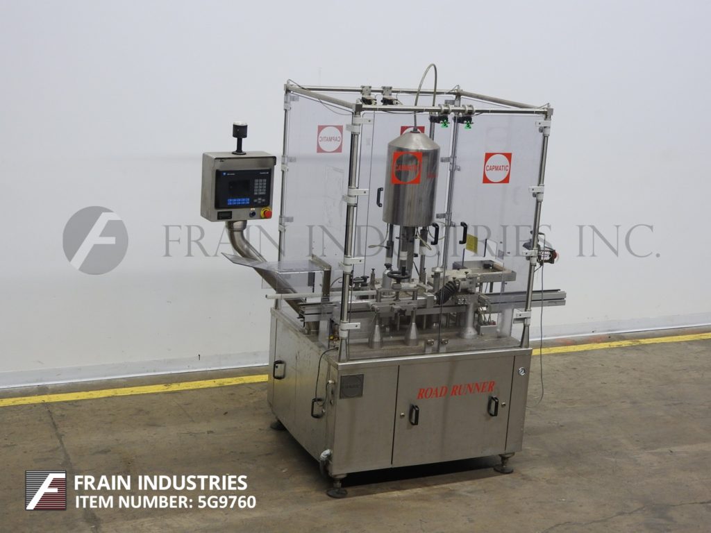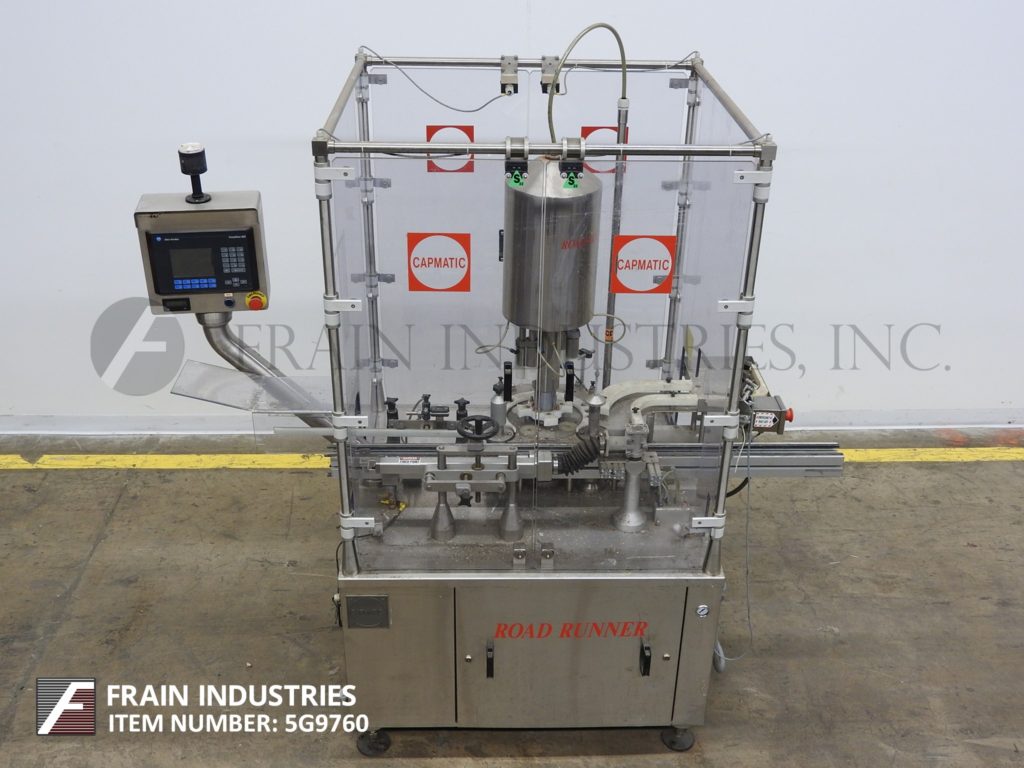 返回所有设备Capmatic,Model Road Runner,4头,不锈钢,旋转帽。每分钟20到100个容器 - 取决于材料和应用盖尺寸范围:10mm至45mm。容器尺寸范围:1(3/16)“至3(1/8)”直径;1(3/8)“至9英寸”高度,具有适当的变化部件。配备64英寸长x 3英寸宽的产品输送机,10“旋转炮塔,带有气动夹头夹头的头部设有5英寸中心,没有容器/无盖帽,弯曲的帽拒绝和互锁安全保护。控制面板具有AB控制器,具有AB PanelView 600触摸屏显示。安装在不锈钢底座上。
