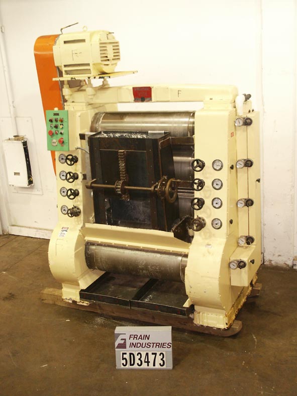 返回所有设备辊磨机用作巧克力块、奶油、肥皂或油墨的精炼机,以确保产品细度均匀。每个滚筒直径为15",W为43",工作表面为39.5" W,并有加热/冷却套。该精炼厂具有产品仓和接收机测量39“W x 51”t,也有液压辊高度调整,控制柜与小时计,自动饲料/清理,犁提升/下降,和E-stop。单元允许独立控制第一卷的旋转速度通过一个变速驱动单元。第一辊被带到第二辊附近,第二辊保持在固定的位置,通过一个液压缸配备一个精确的定位系统。离心铸铁轧辊具有极其坚硬的外表面,允许长寿命和有限的磨损。