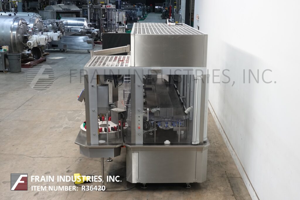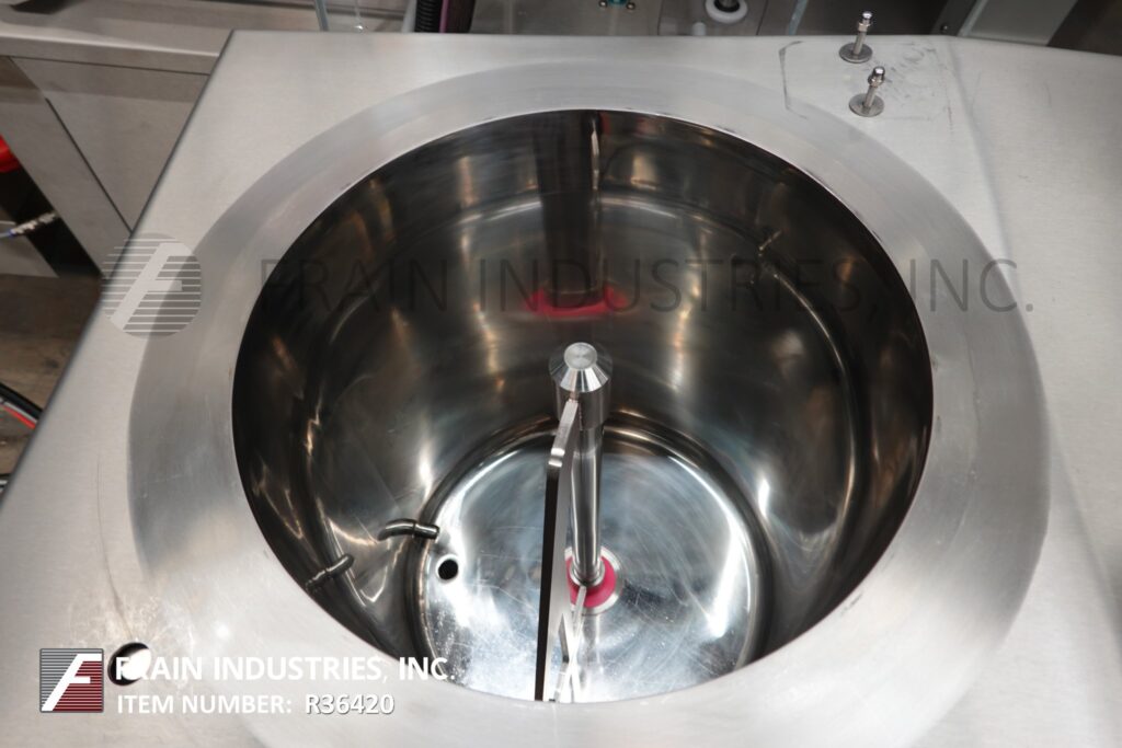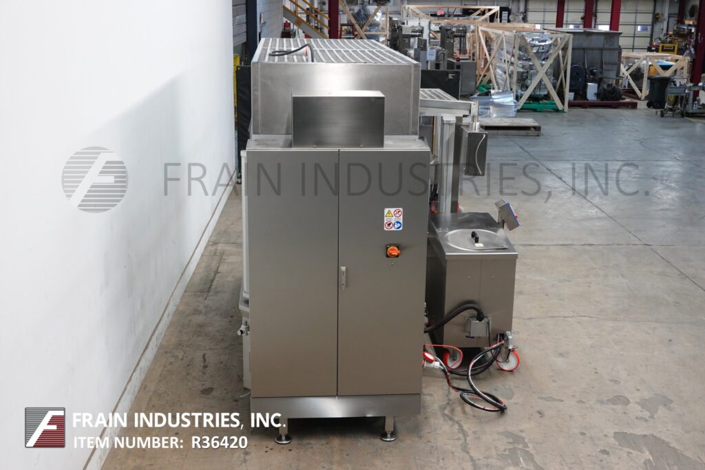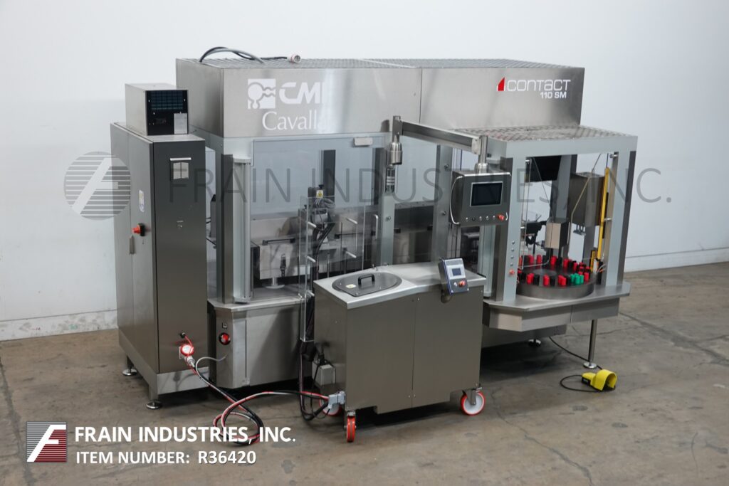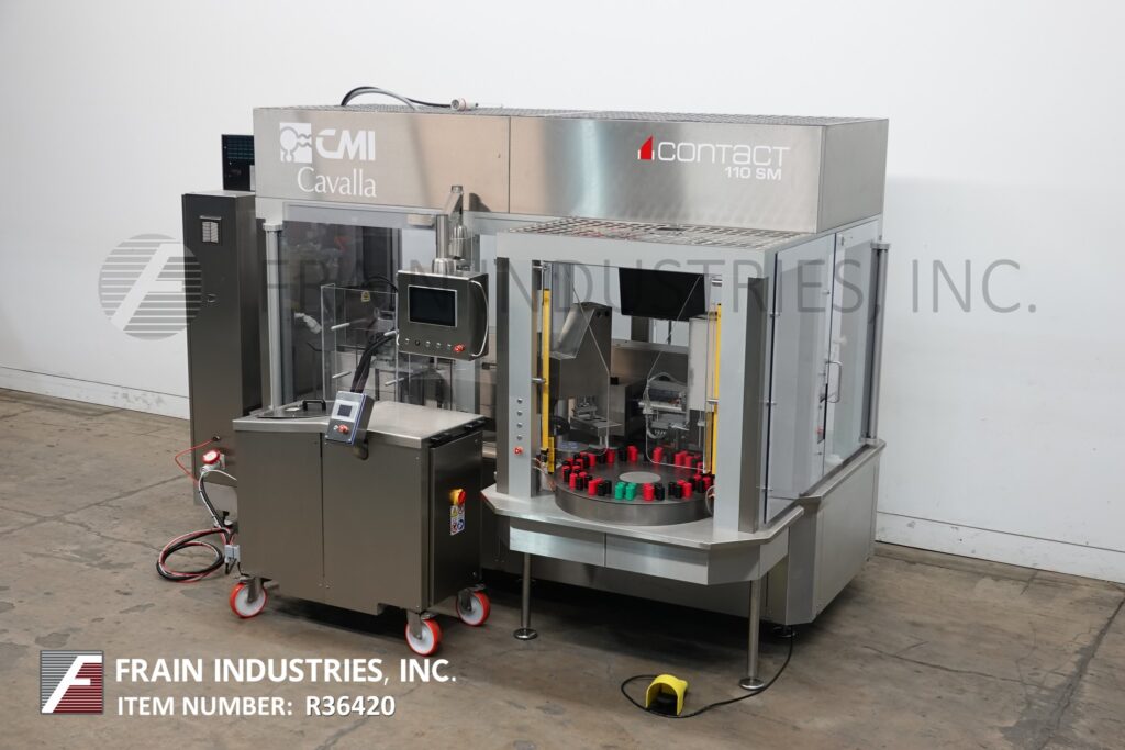 返回所有设备CMI Industries,型号联系110 SM,口红填充机。每分钟的额定值从15到20件。配备48英寸长的霉菌预热隧道,(2)头部蠕动泵热填充带潜水喷嘴和直径16英寸的直径x 17英寸深搅拌供应料斗,顶热站,103英寸长(3)区冷却器,34英寸冷却器,直径34英寸旋转冰车站,(4)头棒demould / load站和(4)头棒旋转到接近站。带西门子控制器和触摸屏HMI的控制面板。