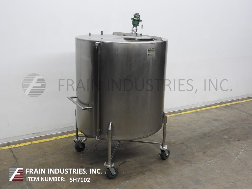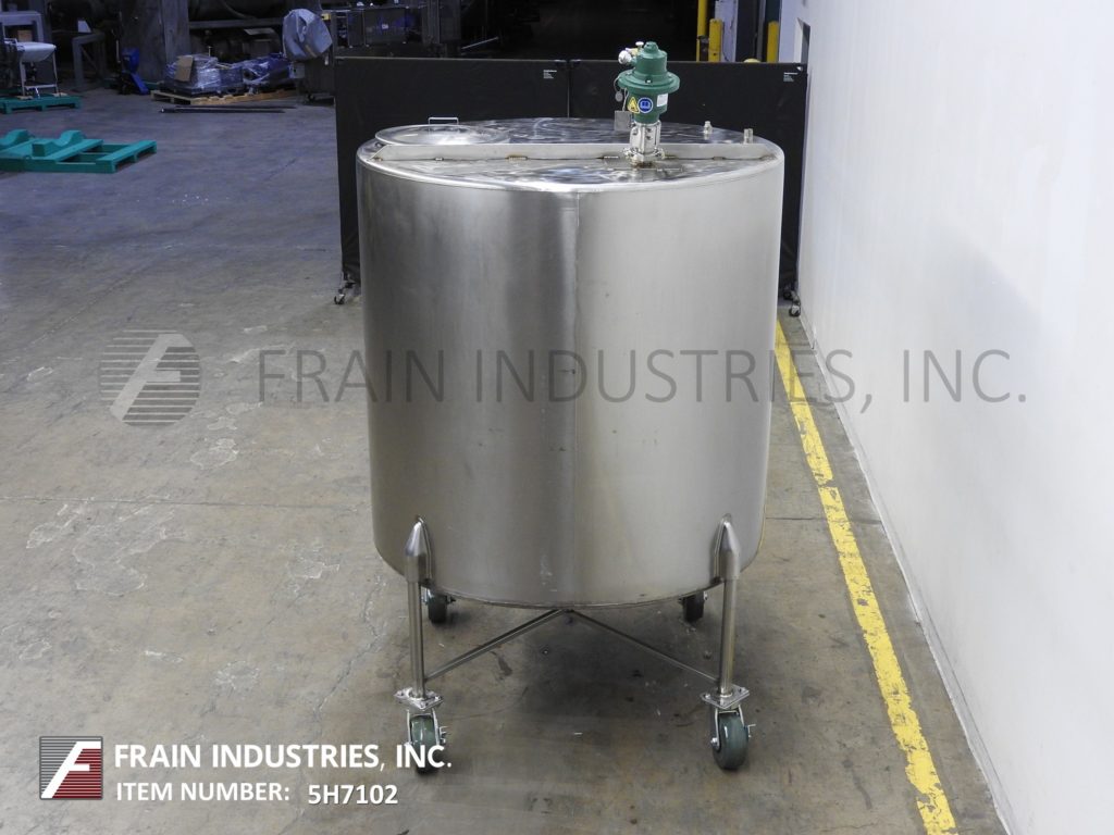 Back to All EquipmentChem Tek, 750 gallon 304 stainless steel single wall holding tank with prop style agitator. Vessel dimensions: 60" in diameter, 60" straight wall. Equipped with 18" diameter manway, top mounted pneumatic prop agitator and slant bottom with 2½"OD / 2"ID Tri-clamp discharge with 18" of ground clearance. Mounted on (4) stainless steel hip socket legs and casters.