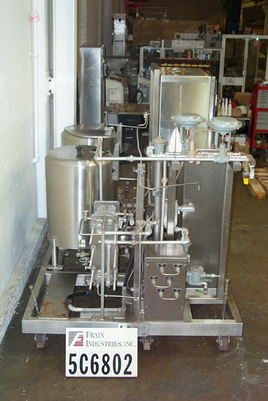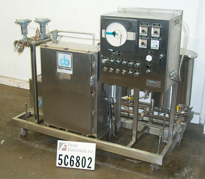 返回所有设备Cherry Burell,全不锈钢,2罐,CIP系统,板框式换热器和不锈钢泵。配备(2)17-1/2/" ID x 21-1/2"深,(约25加仑)不锈钢罐升降盖和搅拌器安装支架,可单独使用,或相互结合使用。樱桃Burrell模型L2RGS、不锈钢板框式换热器16“长x 6”宽板/媒体和卫生,1/3惠普centrifical泵,用于泵清洗解决方案,然后冲洗水清洗过程,(3)·帕特洛型号100 n RTD温度仪表300度f,·帕特洛图表记录器。GE控制包与开关,泵,水,蒸汽和冷却按钮控制。所有2"外径不锈钢卫生连接。安装在94"长x 60"宽不锈钢通用基础框架与脚轮。