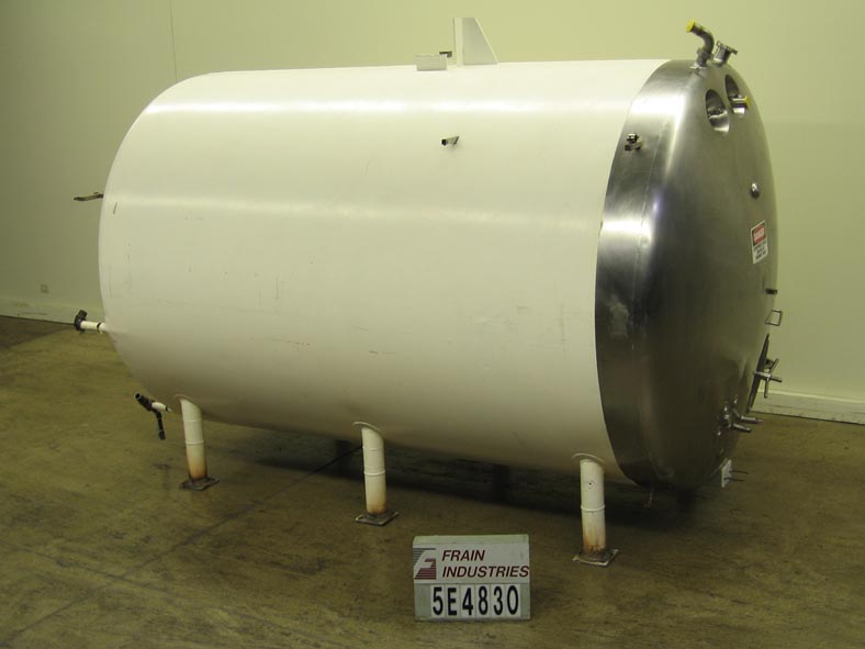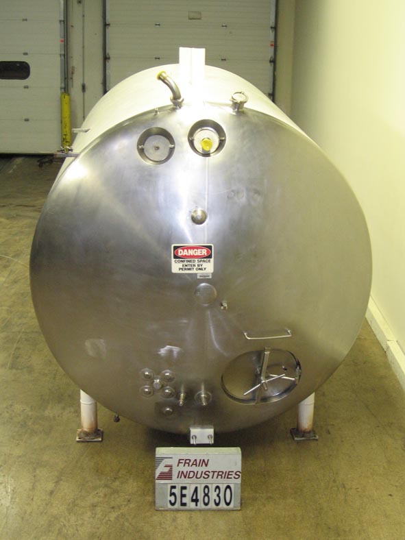 返回所有设备芝加哥不锈钢,3000加仑,304 S/S,水平夹套罐。84" ID x 132"直壁全夹克2" NPT配件,3" dia三三叶草顶部中心进口,和两个3-1/2" dia三三叶草进口/出口,和一个17" H x 21" W人孔,安装在六个腿。