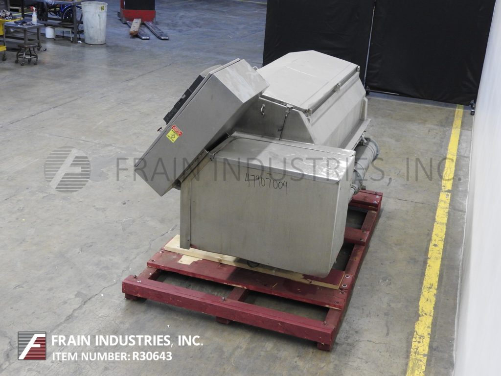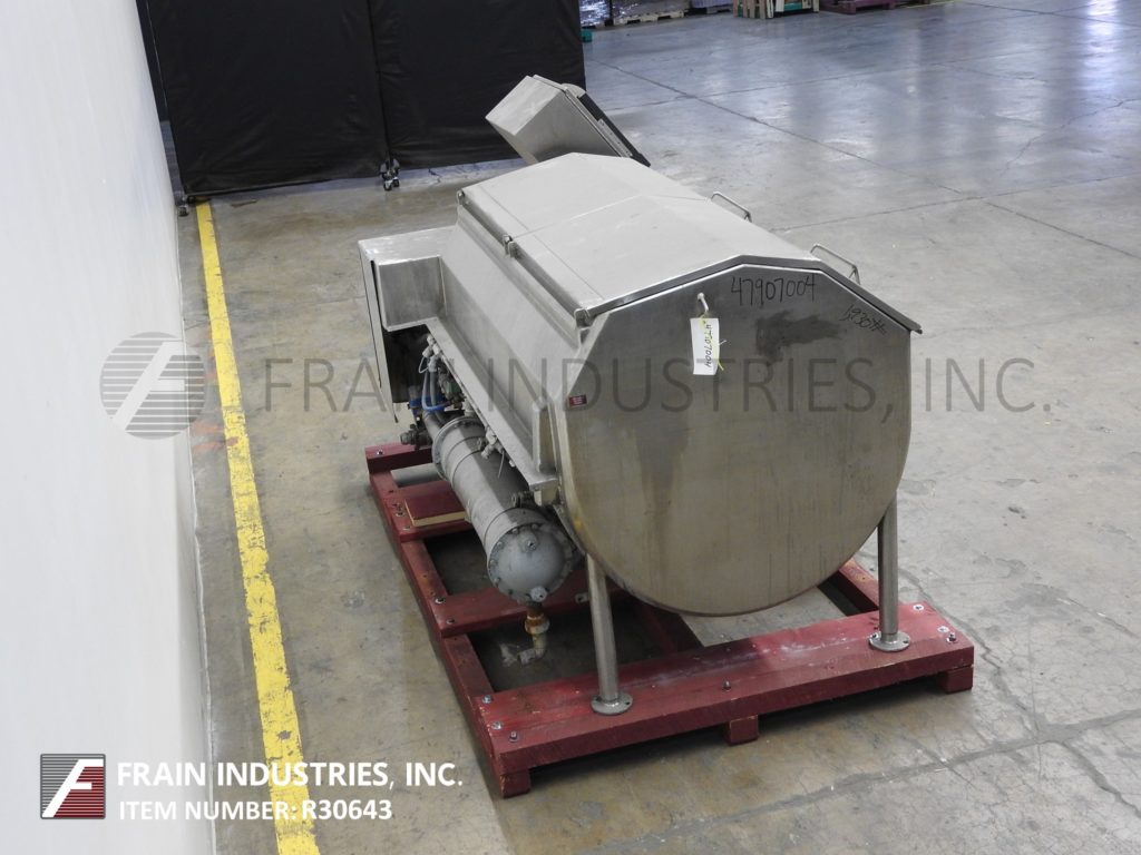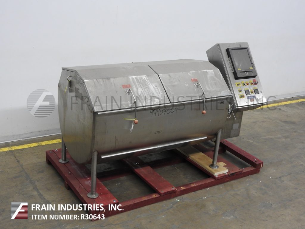 返回所有设备克利夫兰型号tcct - 120cc,组合滚筒式制冷机和烹饪罐,容量750磅或120加仑,每小时可生产磅或加仑的产品-取决于材料和应用。配备42"宽x 72"长x 30"深的夹套罐,在-20至298°f下额定压力为50 psi。带有挡板和检修门,有(2)个铰接顶盖和2英寸底卸料端。采用2马力齿轮电机驱动,配有热交换器、水泵和预置水位的肉探头和水循环泵。控制面板具有可编程时间/温度控制,数字显示。电气和管道采用不锈钢外壳。安装在(4)不锈钢支腿上。