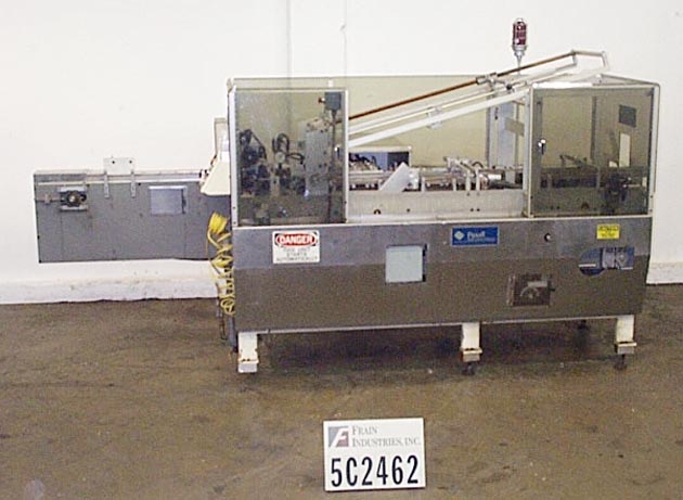 返回所有设备间歇运动,自动装盒机额定每分钟30至60箱,速度取决于材料和应用。尺寸范围:1"至3 1/2"的长度;3/4"到4"宽度;深度2-1/2"至8"。两链系统配备60"纸箱杂志,往复纸箱给料,在饲料桶与36"长的负载区域,旋转产品压实,双推自动加载站,诺信热熔胶系统,无产品-无纸箱,无纸箱-无产品拒绝,真空泵和Lexan保护。