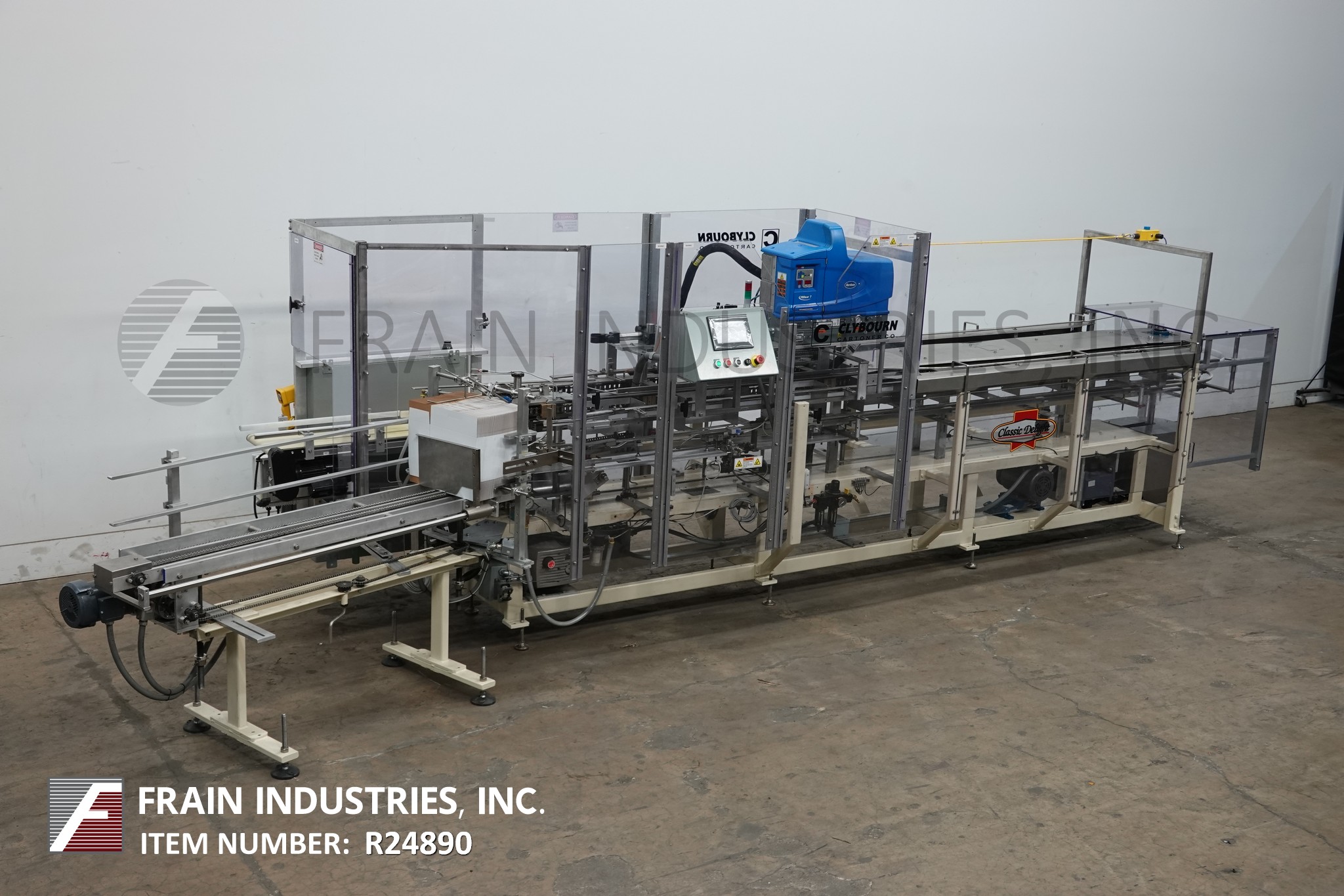返回所有设备克莱伯恩CHL型,半自动连续运动,立式胶盒机,每分钟40 - 100箱,速度视材料和应用而定。配备1条链条,10"中心,6 ' 6 ' L动力空白纸箱杂志,双真空吸盘pickn -place,和纸箱成塑机,5 ' 8"手负荷区域的每一边的机器,诺德森热熔系统,PLC,润滑系统,联锁Lexan安全保护系统。