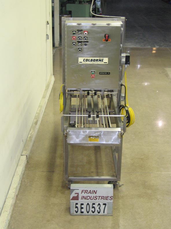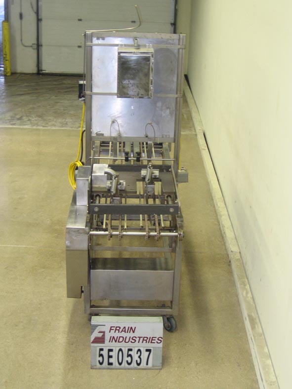 Back to All EquipmentDual lane walking beam fill nozzel system for soft pie filling. Requires depositor for filling. Equipped with adjustable centers currently set at 11-1/2", discharge ports with ID 1-7/8" and OD 2-1/2" and E-Stop. Mounted on casters.