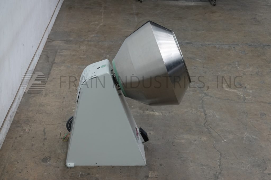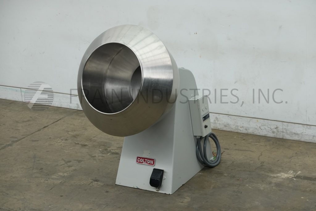 Colton, Model SSV7300CAJDW stainless steel, angular shaped, coating pan with pounds of product per hour – depending on materials, application and operator dexterity. Equipped with 36" diameter x 28" deep coating bowl, 23" diameter product access port with 36" ground clearance and powered by 1.4 Hp motor drive. Mounted on painted base frame.