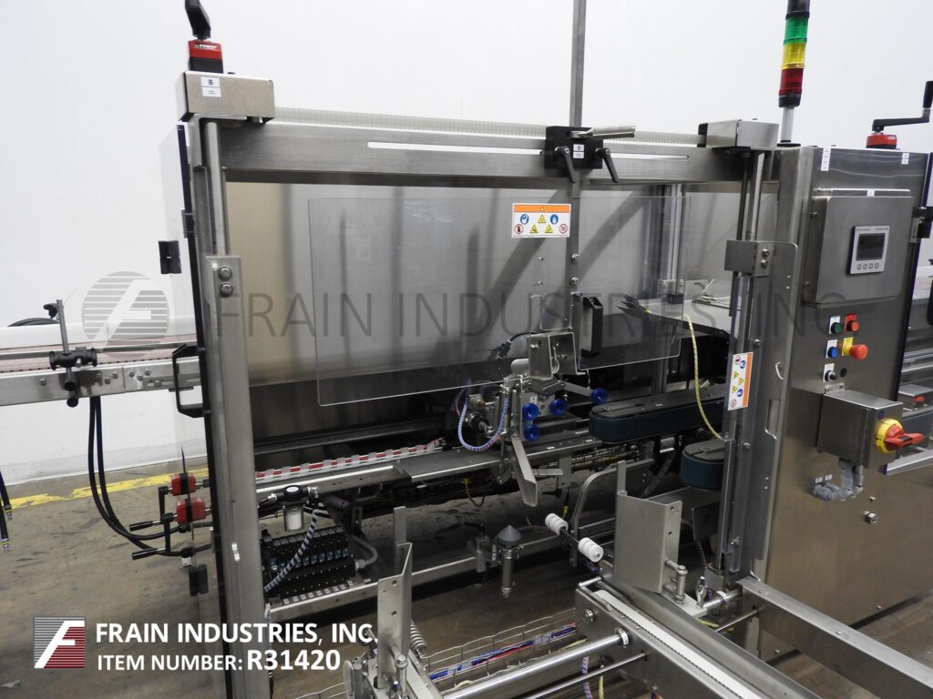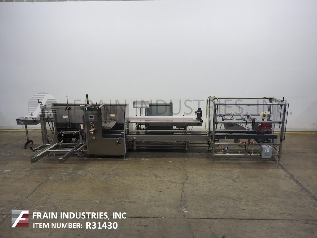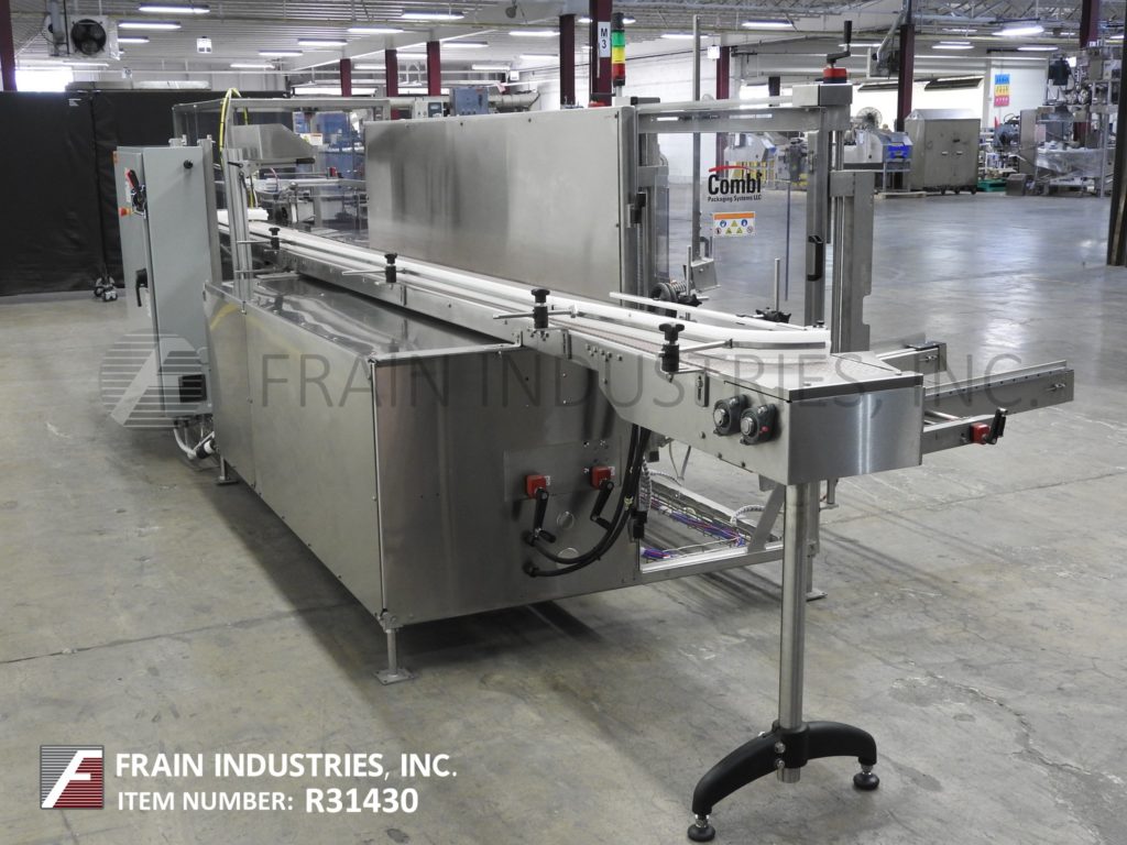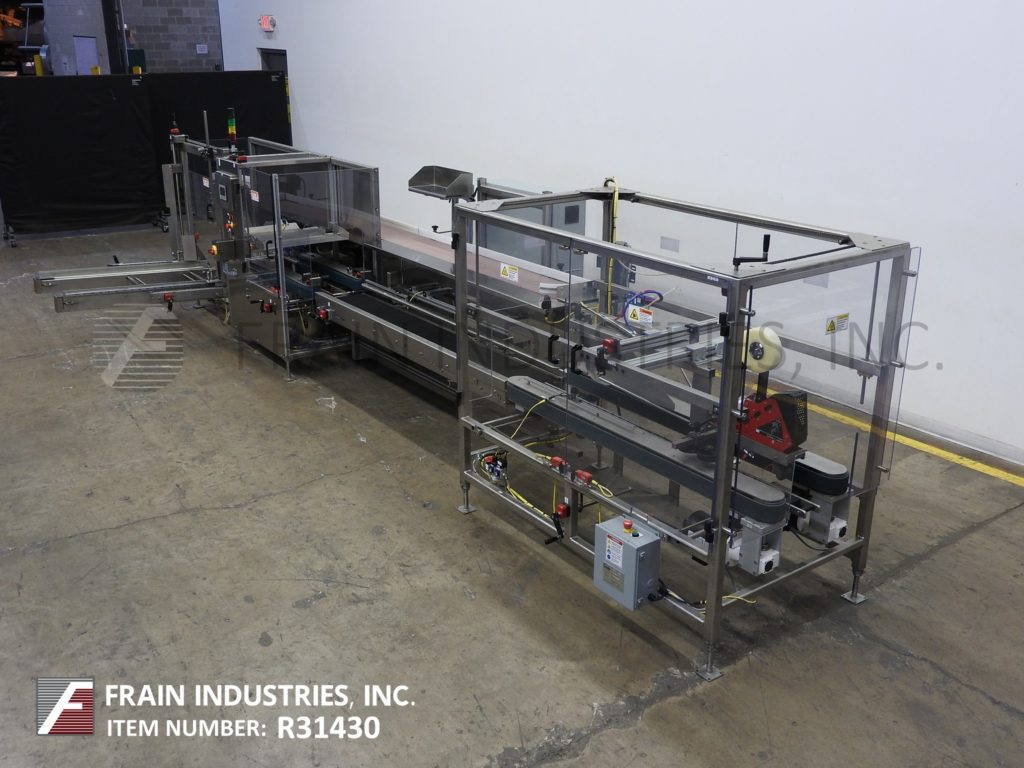 返回所有设备Combi美国,型号2EZSB Ergopack。每分钟5 - 10个病例-取决于材料,应用和操作者的灵巧度。外壳尺寸范围:8"至24"长度;宽度6"至16";身高5英寸到18英寸。配备42"长空白盒杂志,吸盘往复挑选和地方,小和主要皮瓣关闭器,mech推杆,2"磁带头,280"长× 12"宽产品输送机运行平行96"长× 12"宽包装站输送机。安装在不锈钢框架上,高度可调腿和联锁安全防护。不锈钢,顶盖锥度。配备小型襟翼闭合器,主要襟翼犁,3“宽双侧夹持皮带,2”顶部/底部磁带头,手曲柄可调Siko规和联锁Lexan安全保护。带有AB控制器的控制面板。