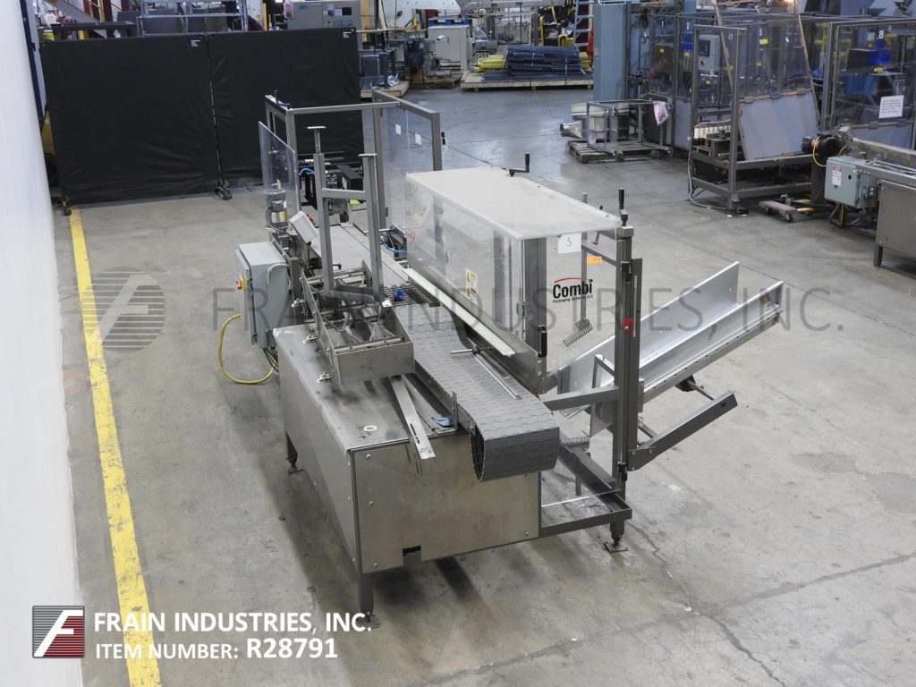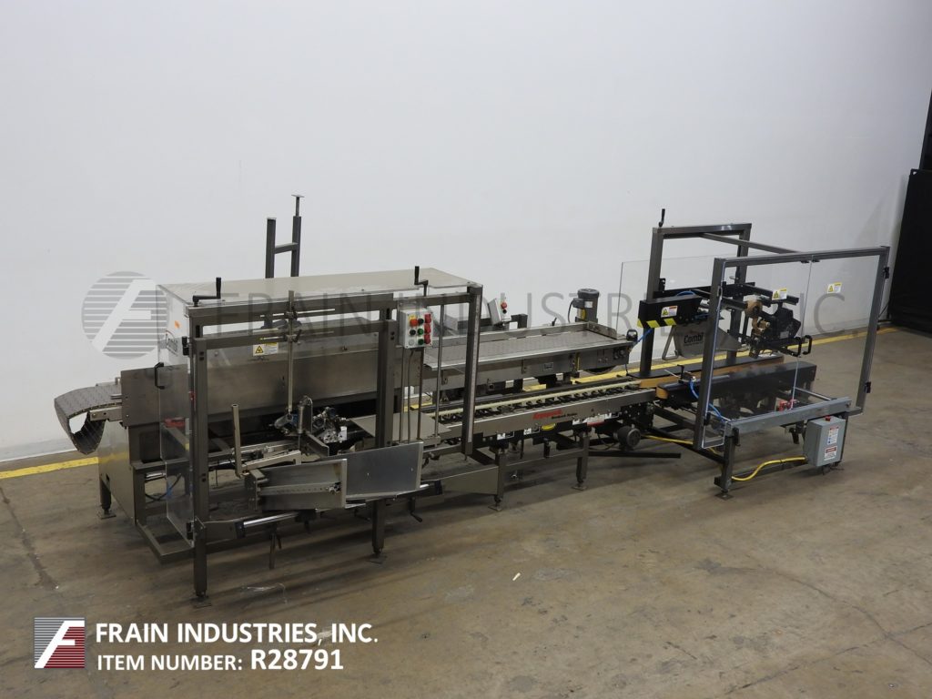 返回所有设备Combi America,型号E-2500 Ergopack,箱包包装系统。额定值为每分钟5至12箱–取决于材料、应用、机器配置和操作员的灵巧度。外壳尺寸范围:长度为8½英寸至20英寸;宽度为5英寸至13½英寸;高度为6英寸至16英寸。配备42“长空白盒库,(2)吸盘往复拾取和放置,盒底部次要和主要翻板闭合器,机械推杆,12”宽x 185”长的Delrin产品输送机,平行于8”宽x 118”长盒输送机,70”长x 3”宽的双面夹持带,通过封口机和2”顶部/底部胶带头。该系统为手动曲柄可调,带有联锁Lexan安全防护和调平支腿。带有两个手动循环控制和按钮操作控制的控制面板。