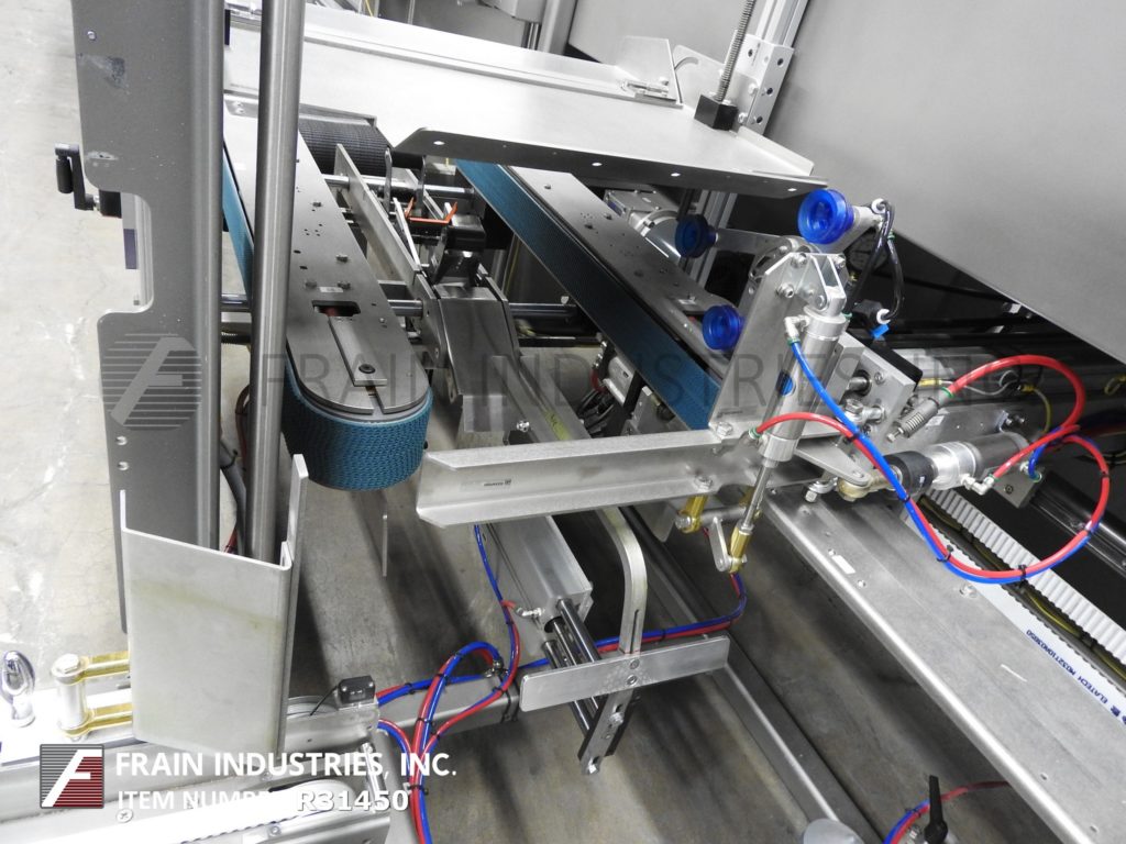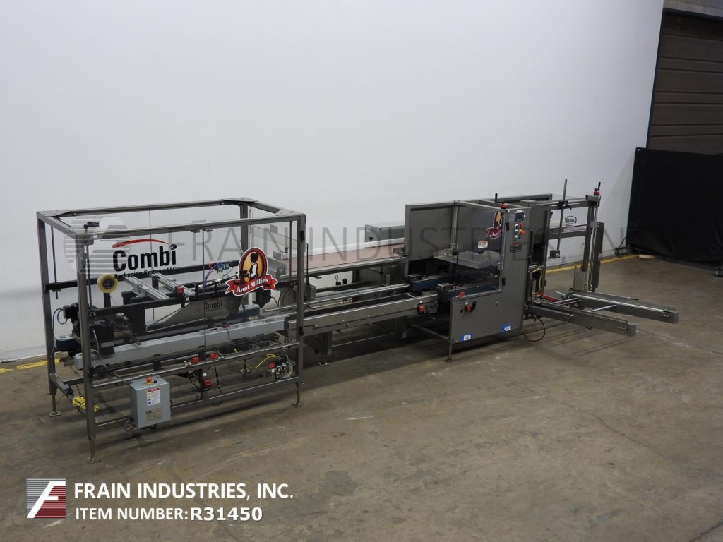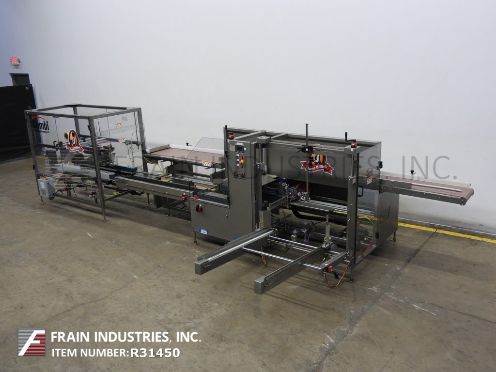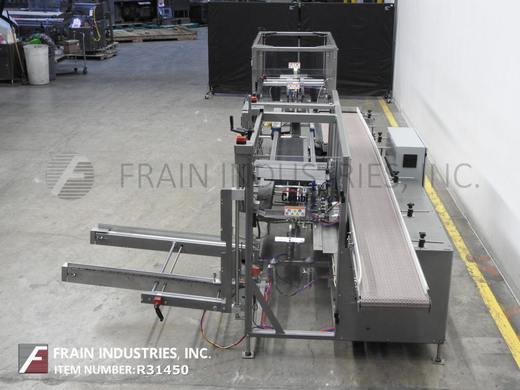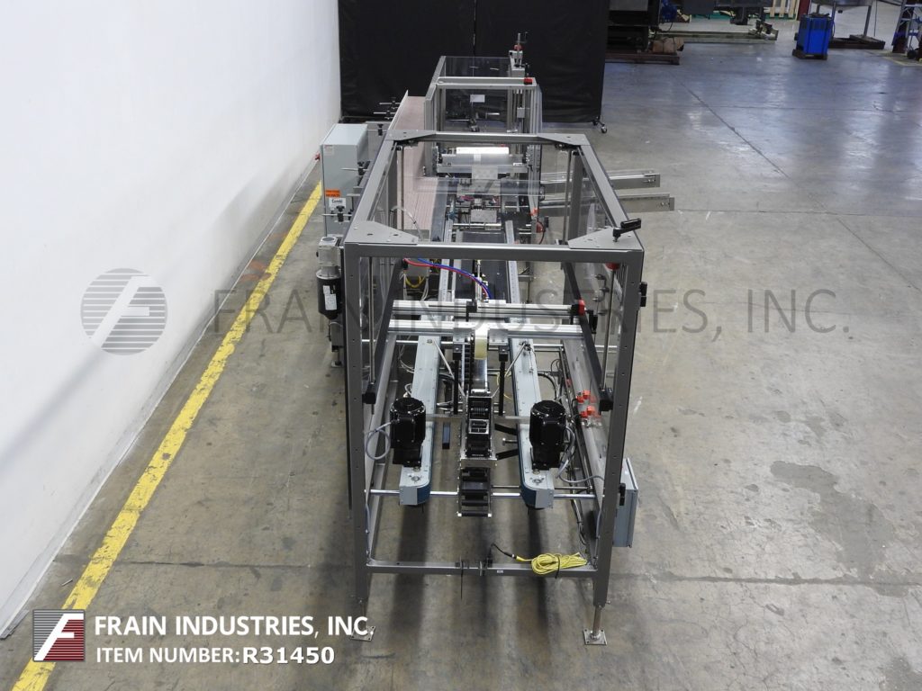 返回所有设备康比美国Ergopack,完整的装箱,包装,胶带密封系统。每分钟5 - 20个病例-取决于材料,应用和操作者的灵巧度。外壳尺寸范围:8"至24"长度;宽度6"至16";身高5英寸到18英寸。配备型号2EZHS高速案例安装42"长空白案例杂志,往复挑选和地方,底部小和大案例皮瓣关闭机械推杆到型号Ergopack,包装站12“宽x 144”长Intralox产品输送机平行16“宽x 70”手动曲柄调整橡胶带包装输送机,tbs模型- 100 FC,自动的,袋盖面近,顶部/底部宽情况下锥形72“长x 3”双侧皮带输送机,主要/次要皮瓣犁与2"磁带头和控制。所有安装在重型框架与水平腿。