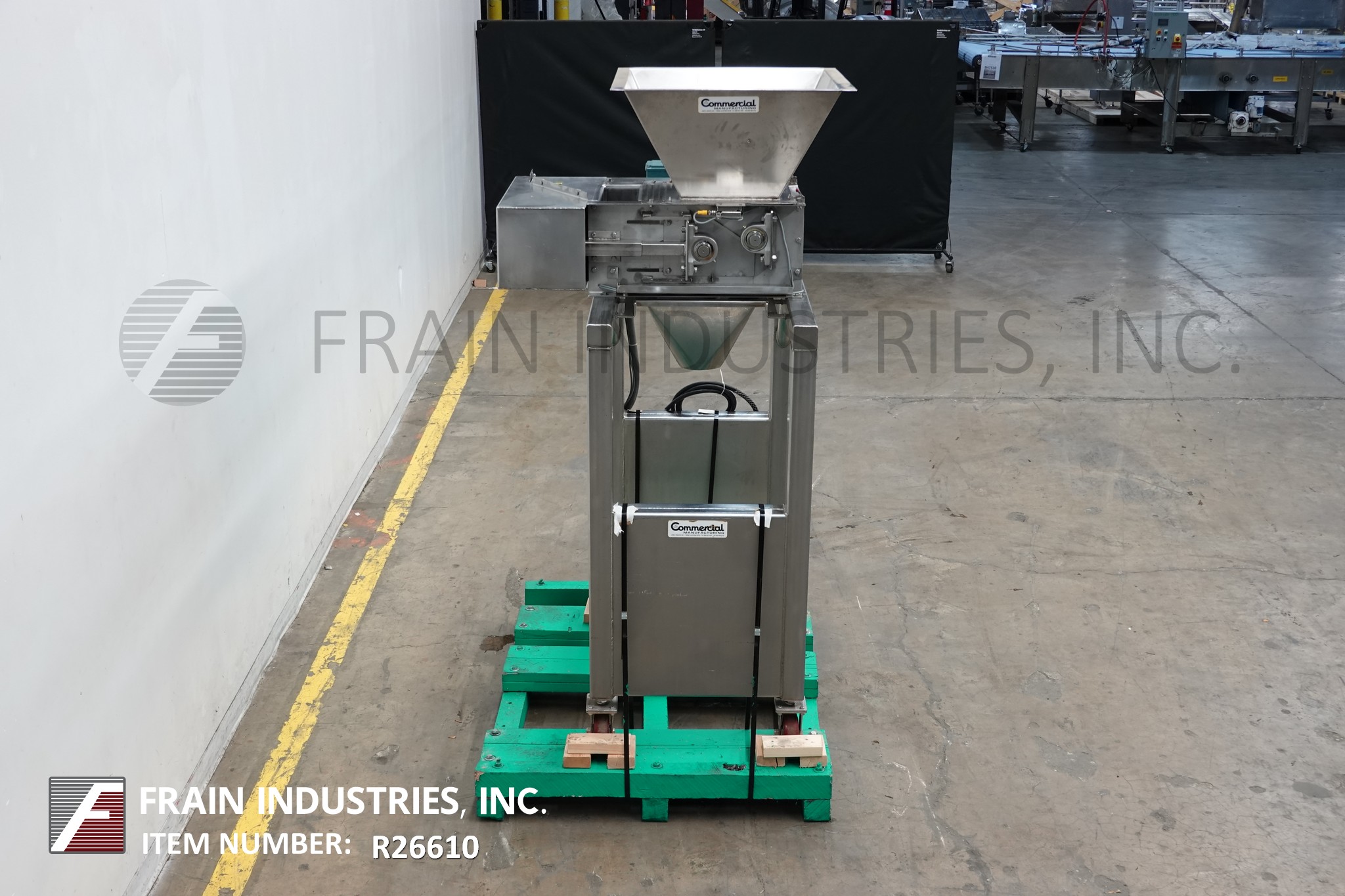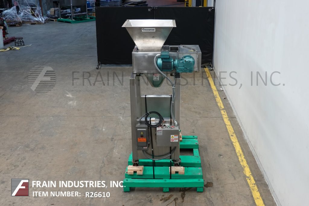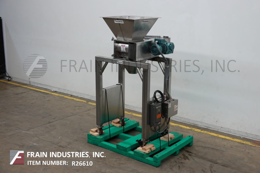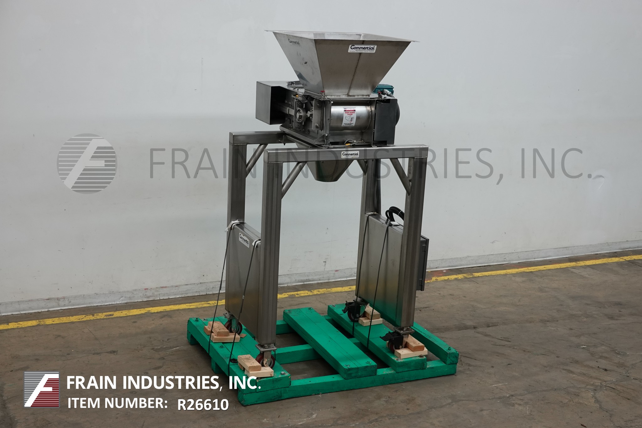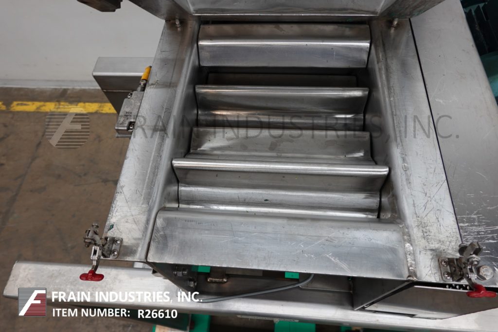 S/S卸料机,25"长x 25"宽,6英尺³,散装产品料斗。单元有两个8"直径x 12"长"5口袋"旋转瓣倾倒5"中心和一个6"直径中心底部卸料40"地间隙。安装在S/S基础框架与脚轮。