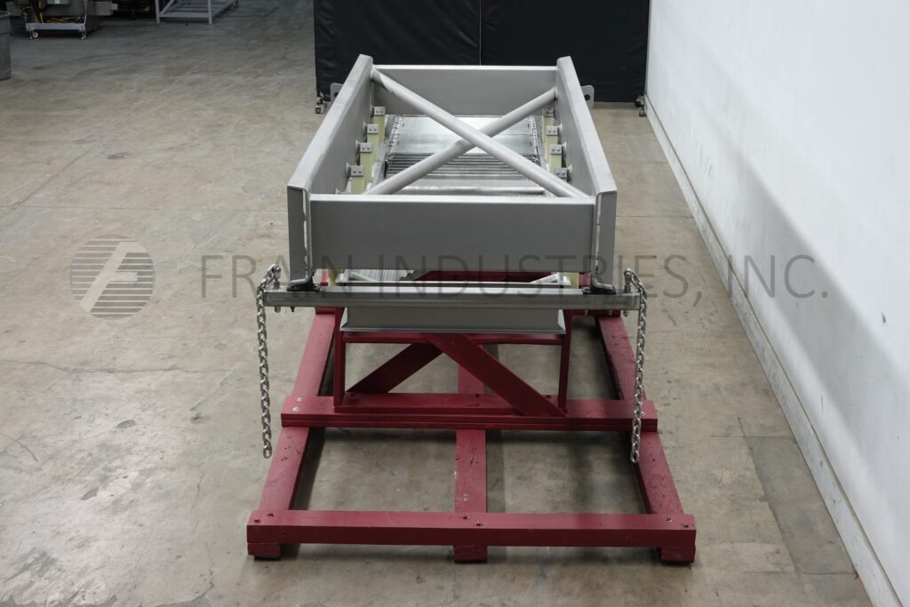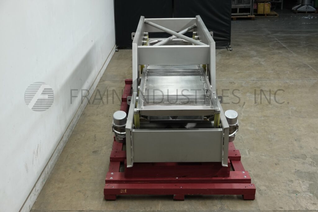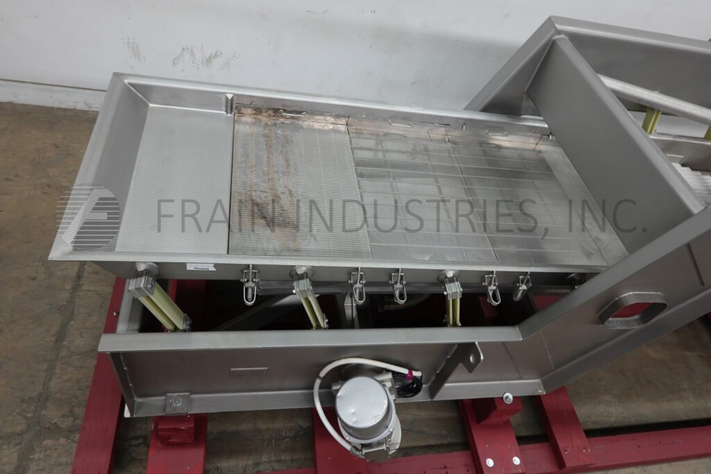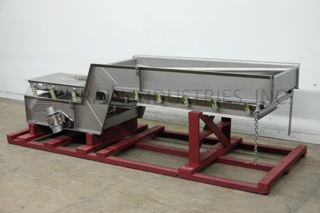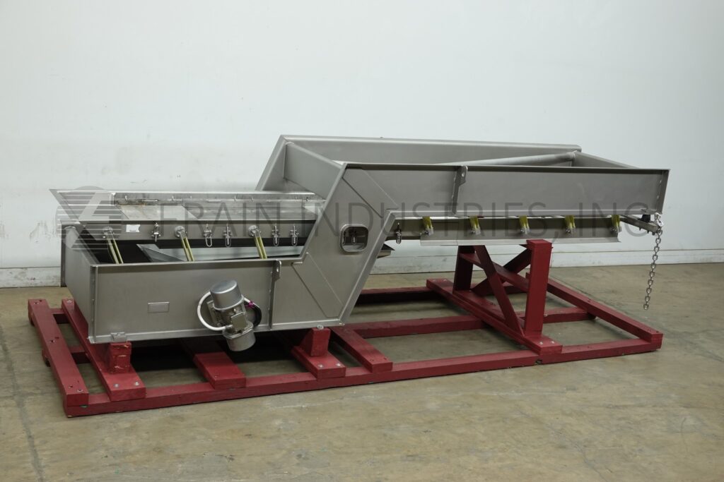 回所有设备商业制造、虚拟化、分离、分片分解和配送系统时时产品量-视物料应用而定配有传送器测量值: 192长36宽6深单层振荡传送器顶部 84"长x36宽x1"深不锈钢,可拆卸屏带245毫米开关和76'Lx28'W溢出产品槽剩余产品滴入有(30)1⁄2'H槽和右角产品排出24+二叉子hp马达驱动器安全卫士挂在重值不锈钢架上