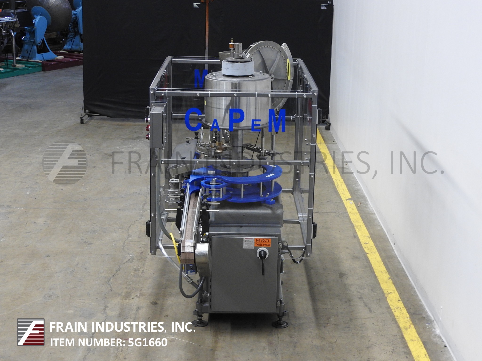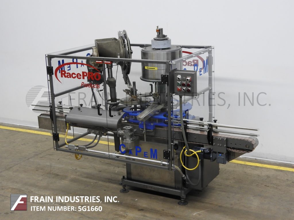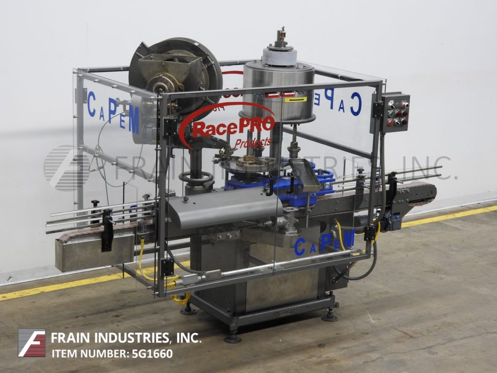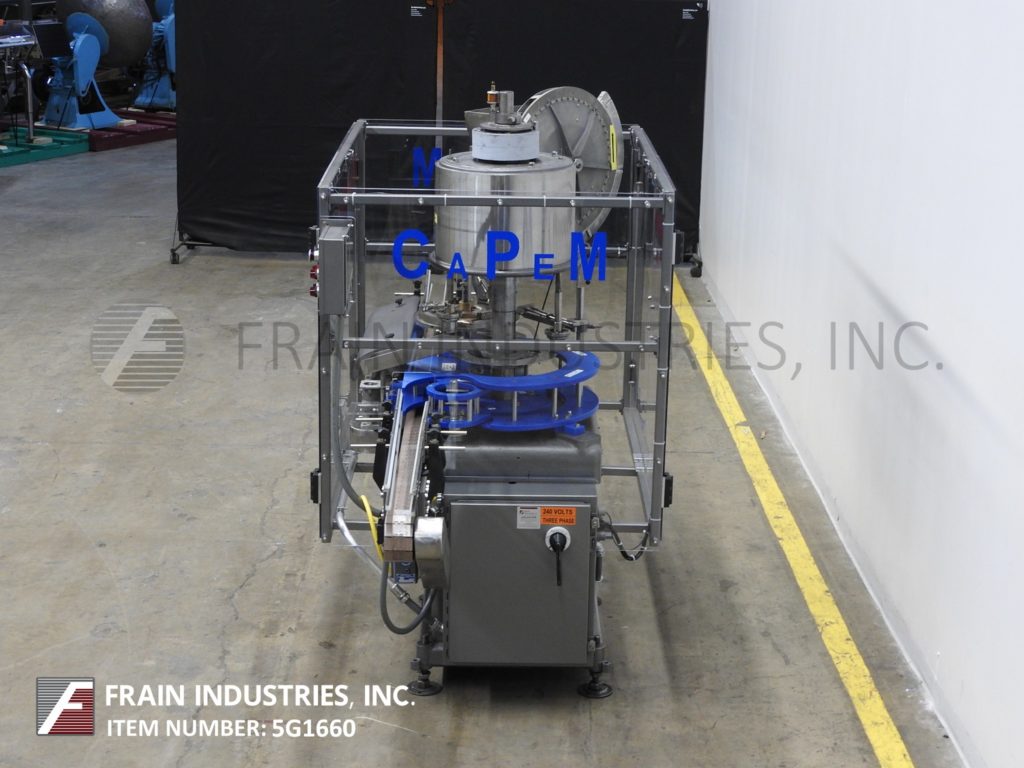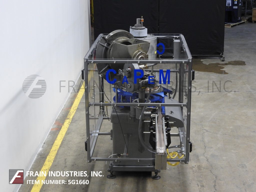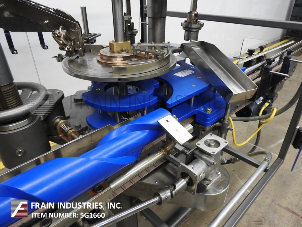 返回所有设备综合模型D-4,自动,2头旋转,卡盘压盖机额定从10到60个容器每分钟-取决于材料和应用。瓶盖尺寸范围:高达89mm。容器尺寸范围:直径可达6-1/2";和高达12英寸的高度与适当的变化部分。配备96英寸长x 3-1/4英寸宽德林皮带输送机,24英寸蜗杆到星轮进/出料,24直径帽分选轮带料斗。控制器与机器启动/ e-stop,慢跑,帽给/帽供应控制和安装在重型基础框架。