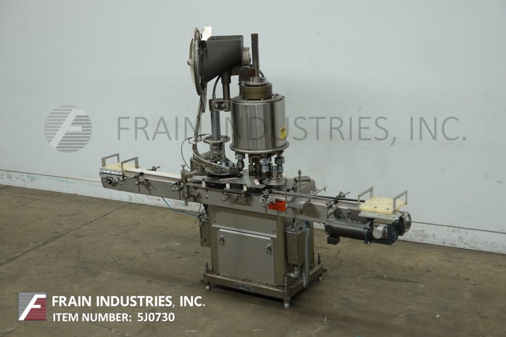 Back to All EquipmentConsoilidated / Capem / Pneumatic Scale, Stainless steel, Model C-F-4, Automatic, 4-head rotary chuck capper, with cap hopper, sorter and feeder. Rated from 40 to 120 containers per minute – depending on materials and application. Maximum cap size: 70mm. Equipped with integrated cap feeder and hopper, disc unscrambler, cap chute and button, 112" long x 3½" wide container conveyor with star wheel in feed and discharge, no container / no cap and (4) chuck capping heads. Mounted on heavy duty frame.