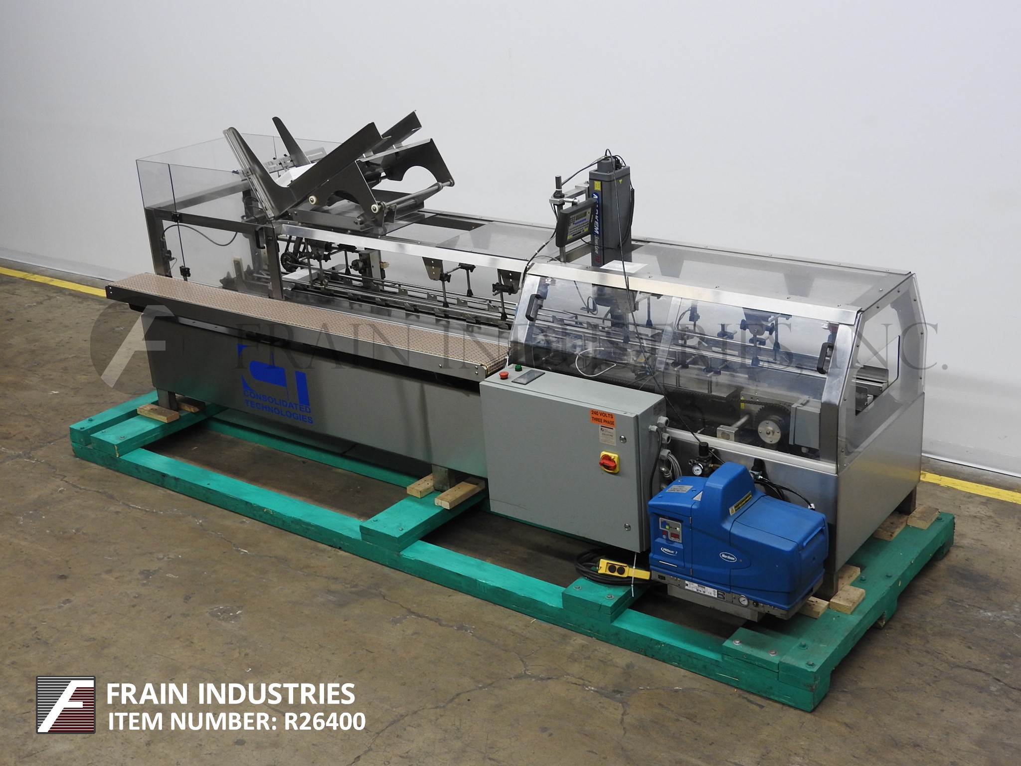 返回所有设备联合技术HC-120C型,不锈钢,半自动纸箱机,额定每分钟20至100个纸箱-取决于材料,应用和操作熟练度。纸箱尺寸范围:长度1 - 5";3/4"到2-1/2"宽度;深度4至12英寸。四链系统设置在7.5英寸中心,1.5英寸高凸耳。配有36"长纸盒杂志,2头旋转挑选n处,顶部围栏,9"宽103.5"长产品在饲料输送机和60"装载站。安装在不锈钢底座上。