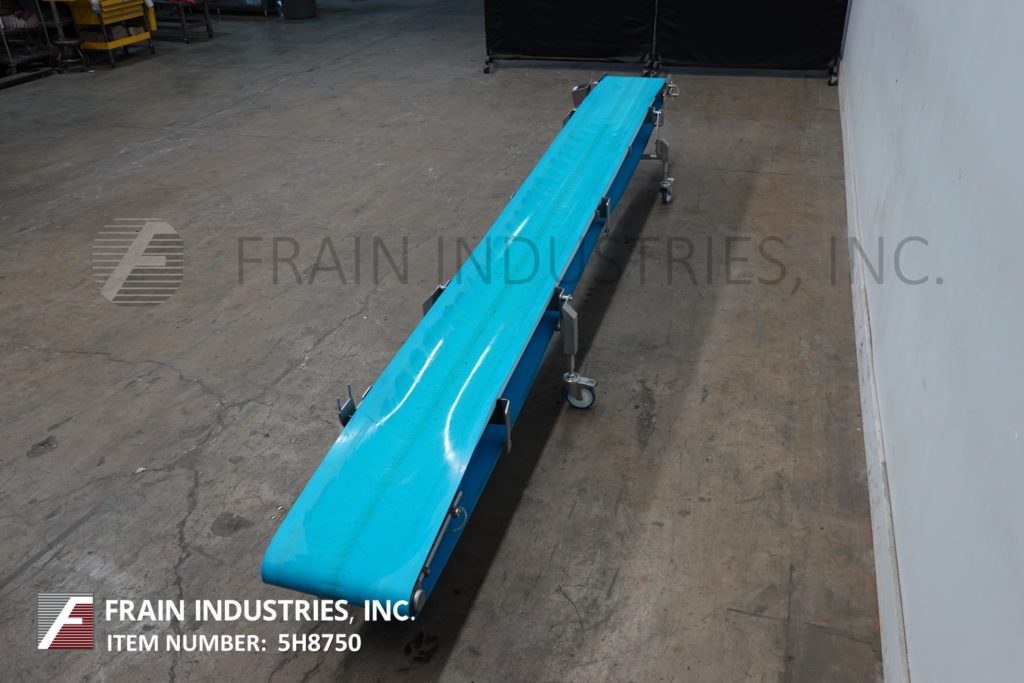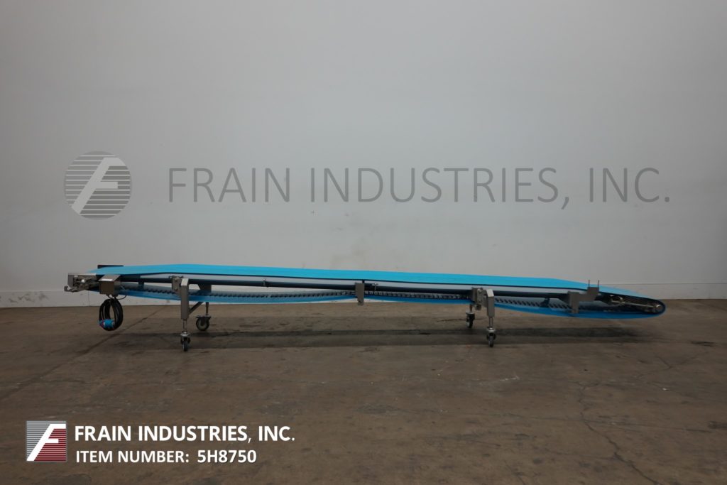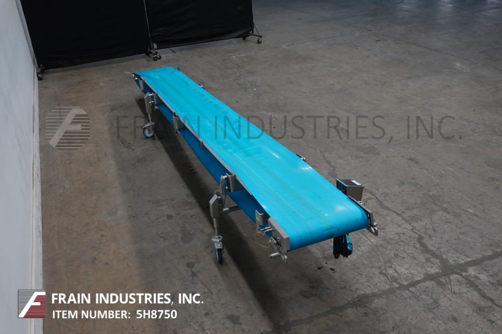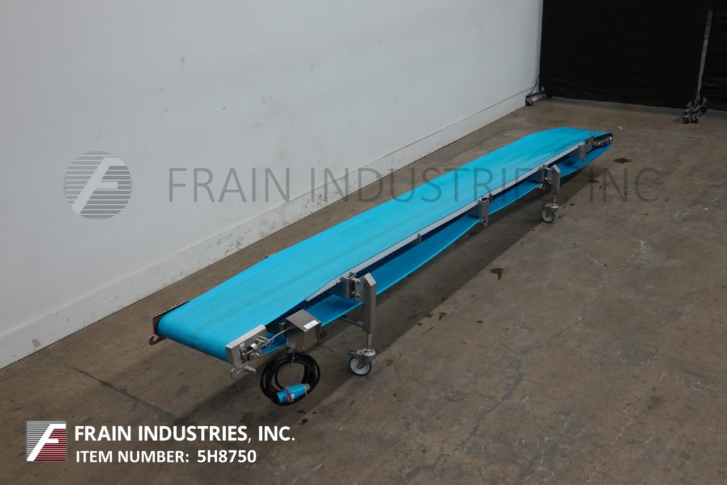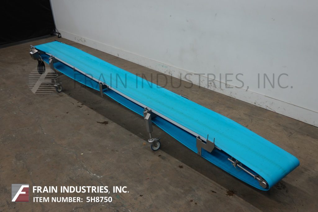 倾斜不锈钢输送机。配备一个15“饲料高度,18“宽x 190”长槽式食品级皮带,25“放电高度。安装在带有脚轮的(2)腿不锈钢底座框架上。