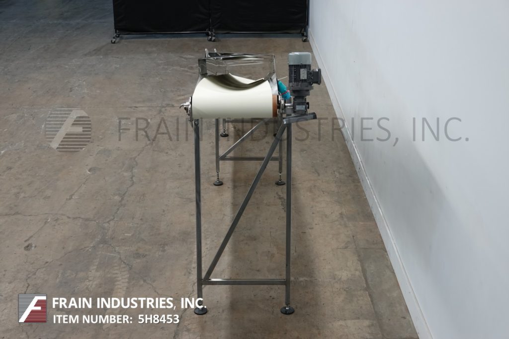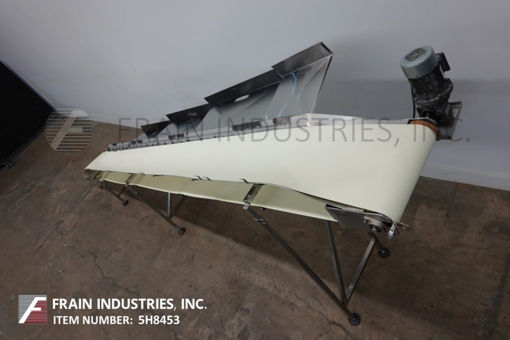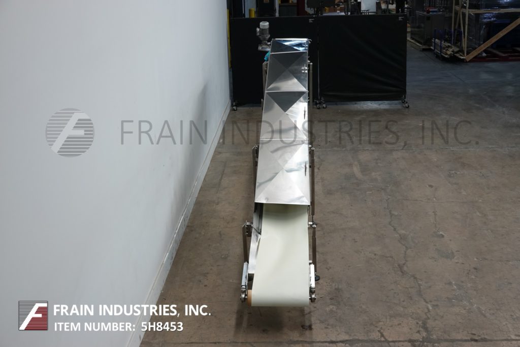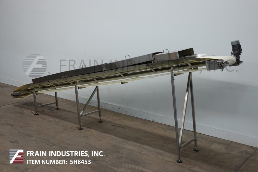 输送机制造和服务公司,倾斜不锈钢,19"宽x 228"长输送机。配备15英寸高的进料,带肋的橡胶带,提升盖和75英寸高的排放。由½HP驱动。