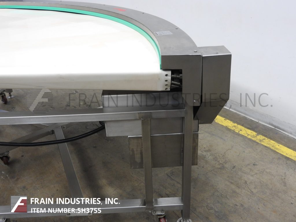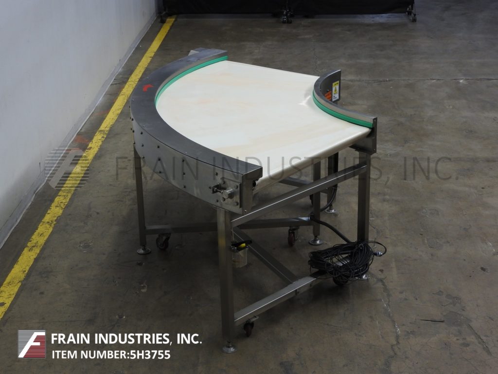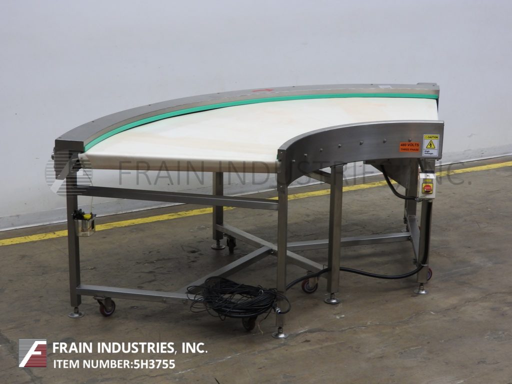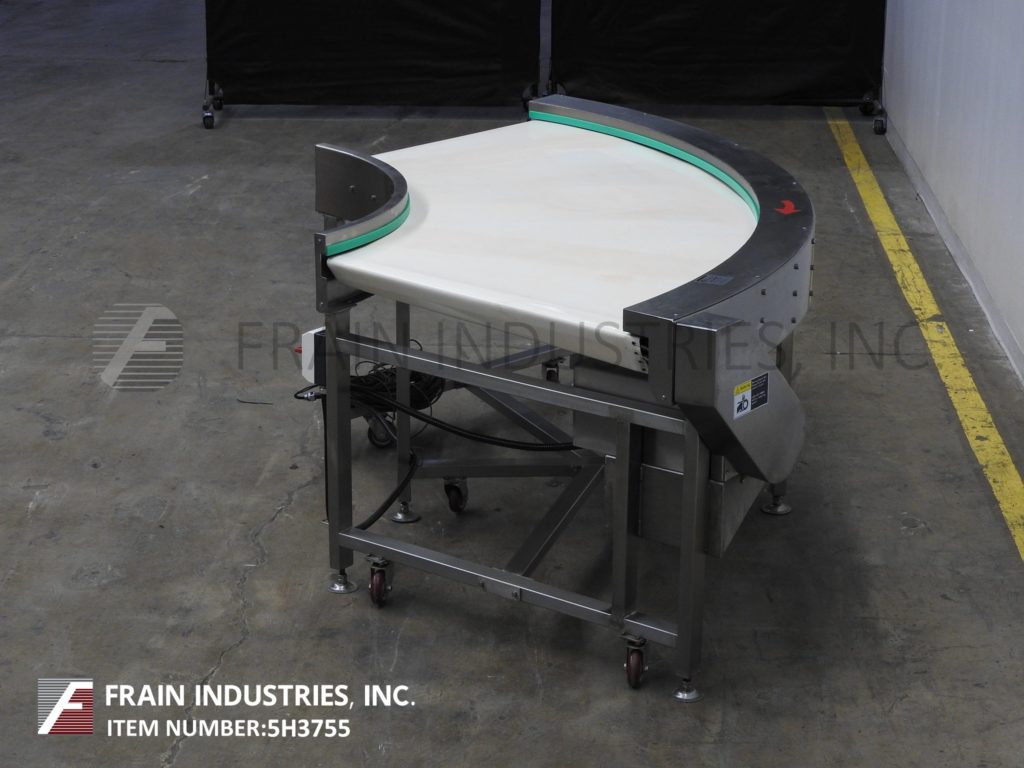 90°弯曲,39“W X 102”L,不锈钢,带式输送机。产品行驶48“进入90°曲线,然后在放电之前行驶54”。安装在(6)高度可调腿与脚轮。