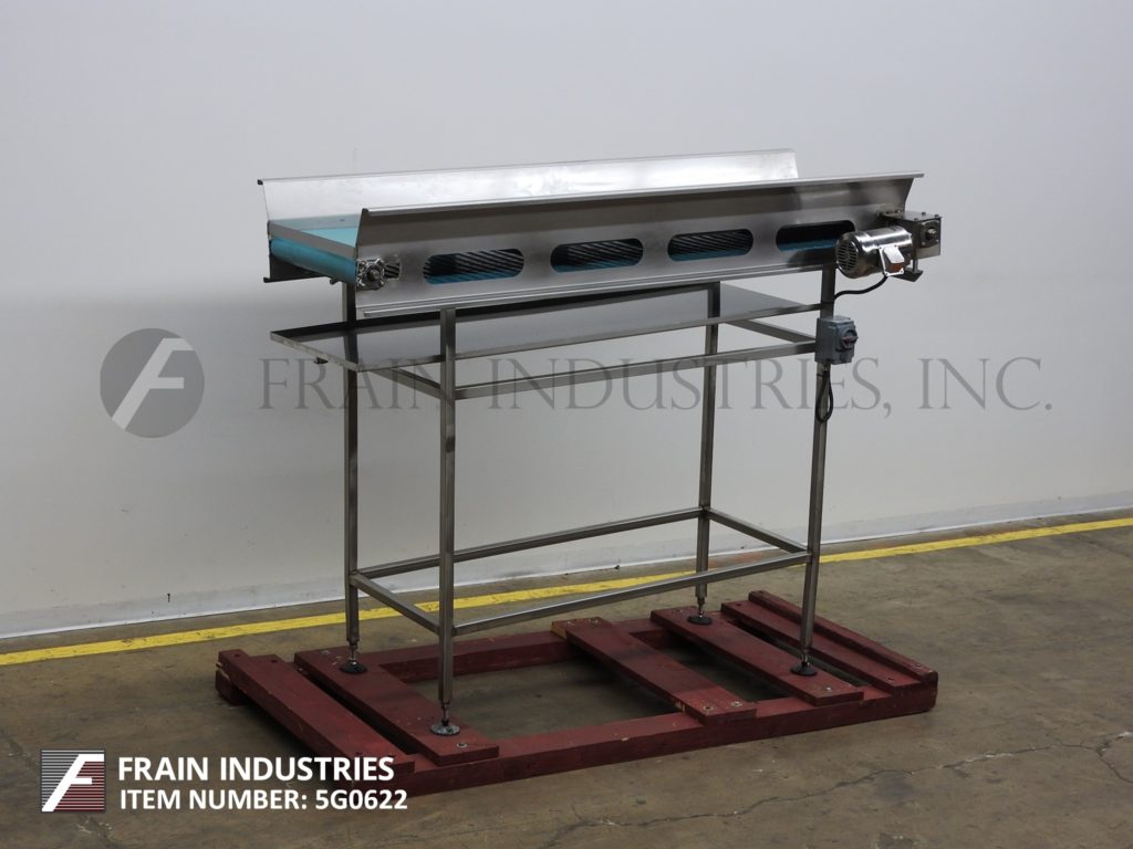 Back to All Equipment94" X 24" stainless steel neoprene belt incline conveyor. Equipped with 65" high infeed and 72" high outfeed, 4" fixed guide rails, 1 HP fixed speed motor and stainless steel frame with fixed legs