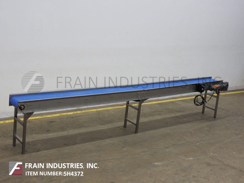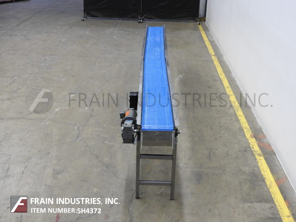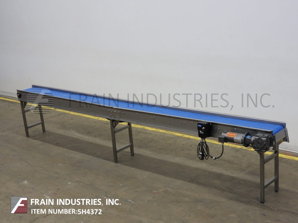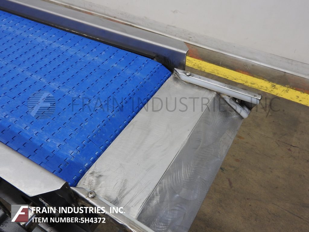 Back to All EquipmentStainless steel, table top conveyor. Equipped with a 12" wide x 188" long Intralox belt powered by a ½ Hp drive, on/off switch, VFD and mounted on (6) leveling legs with an infeed / discharge range of 34" to 38".