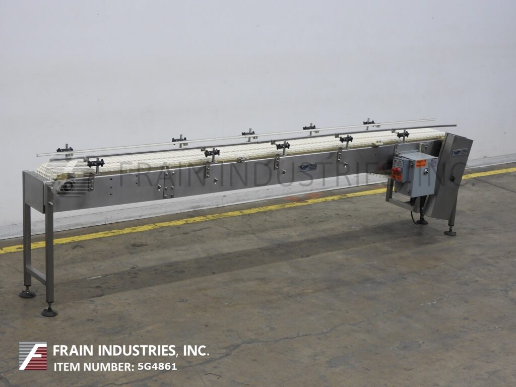 Back to All EquipmentVan Pak, 10" wide x 142" long, stainless steel flexlink belt conveyor. Equipped with a 1 hp drive with variable speed control, roller transfer plate on both ends and mounted on screw in leveling pads.