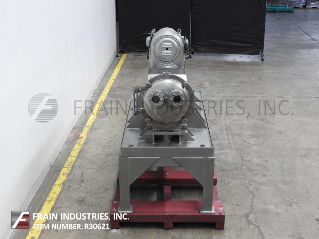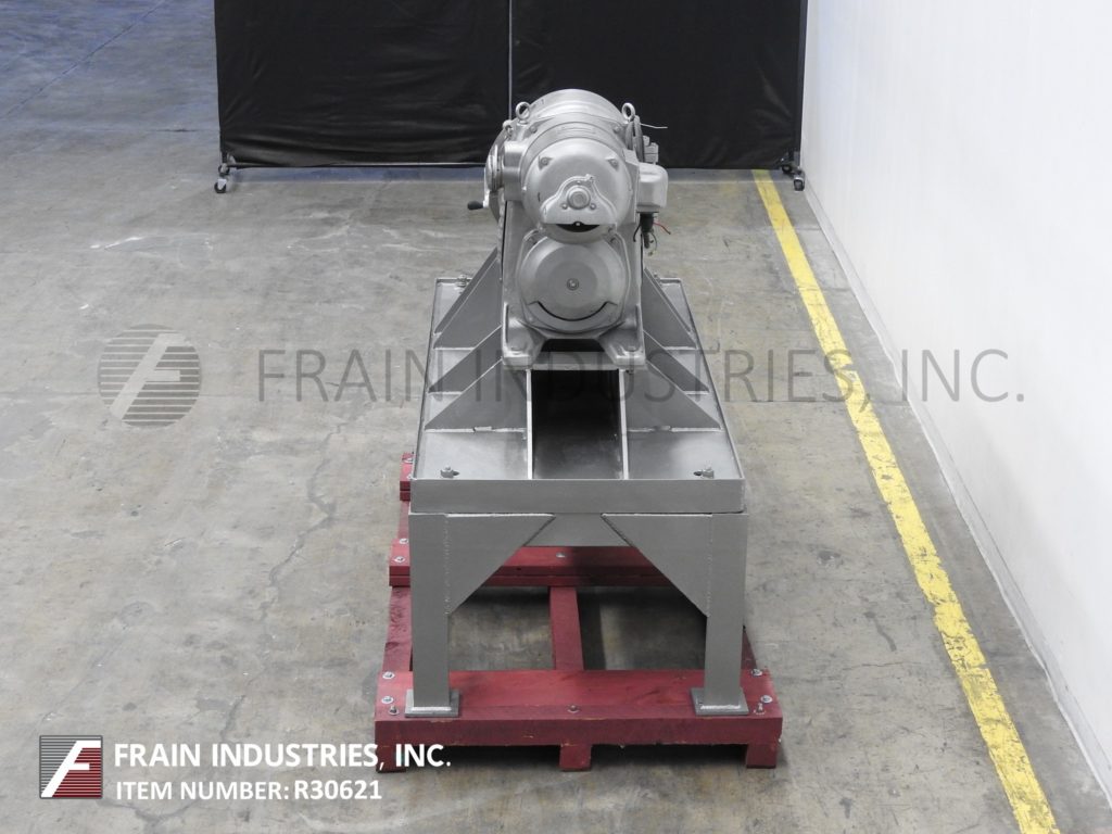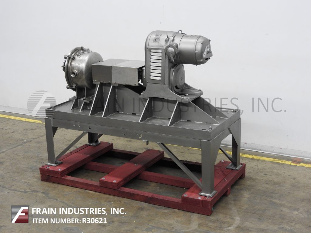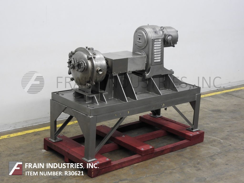返回所有设备康奈尔,型号D16,变速“Versator”额定转速从1到20加仑/分钟-取决于材料,应用和机器配置。配备16" ID盘,额定转速从1200到3220转/分,与(2)2" NPT侧室在进料和排出产品端口,(1)2" NPT顶部真空端口,压力表和(1)1½" NPT底漏。压下盖(2)3“ID视线端口和5马力电机驱动器与变速齿轮减速器。安装在重型油漆基础上。产品通过薄膜形成的环流出,然后经过旋转圆盘表面,在那里发生分散和除氧作用,用于食品、化妆品、制药和化工产品的分散和除氧。