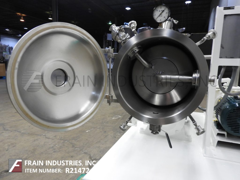 返回所有设备S/S“卫浴Versator”带真空系统。配备7.5马力变速驱动器,转速范围从1200转至4000转,流量高达20加仑每分钟,取决于产品。产品通过成膜环流出并流过旋转圆盘的表面,此时分散/除氧作用发生。包括带有工地玻璃的快速释放盖。