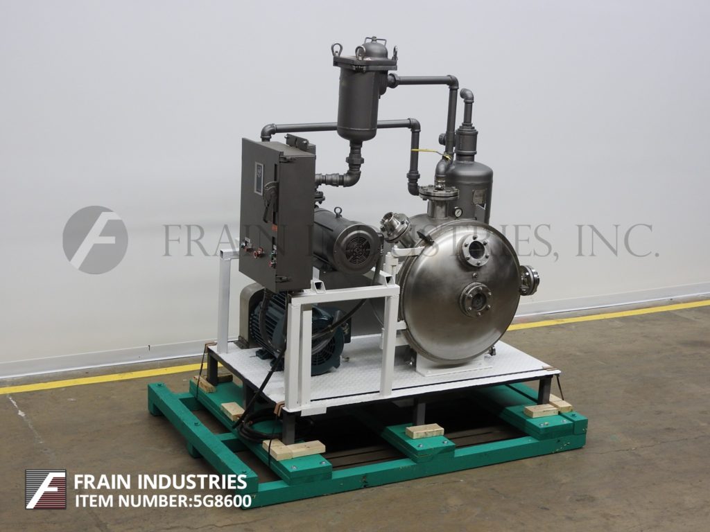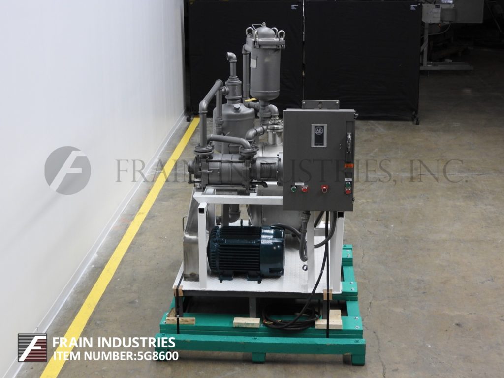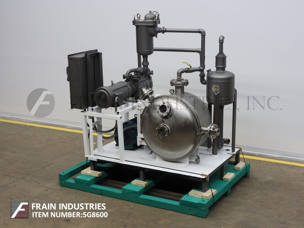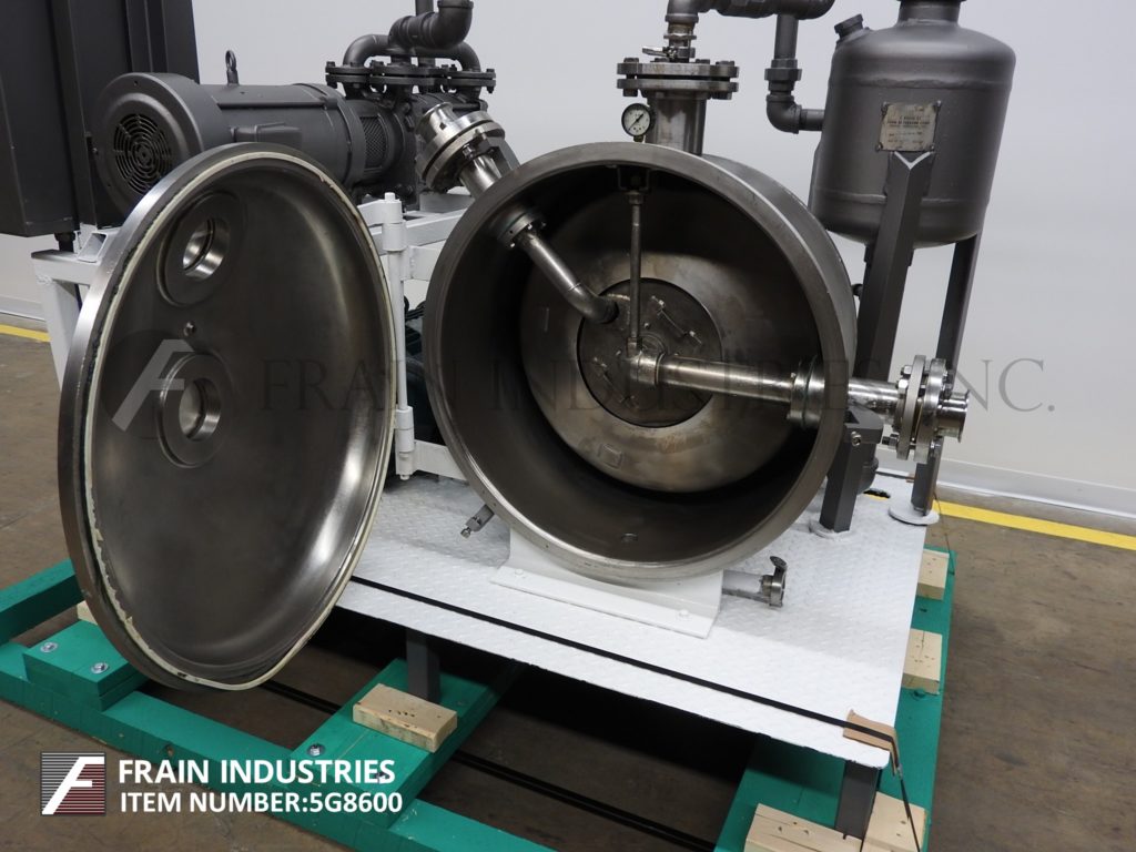 返回所有设备康奈尔型号D26,“Versator”除氧器,真空系统额定从5到125加仑每分钟-取决于材料,应用和机器配置。接触部件采用316不锈钢。配备26" ID产品转盘,(2)7"外径法兰侧腔产品在进料和排出产品端口,(1)9"外径法兰顶部真空端口,带压力表和底部排水。向下旋开螺栓,门有(2)7”外径,4”内径前法兰视孔。25马力(4)皮带到电机主传动,带安全防护,液环真空系统,外径(4)4英寸,带电机传动法兰端口和真空管路敲出罐。2 3/4"直径进口/出口端口。安装在68"长x 48"宽油漆平台风格的基础框架。