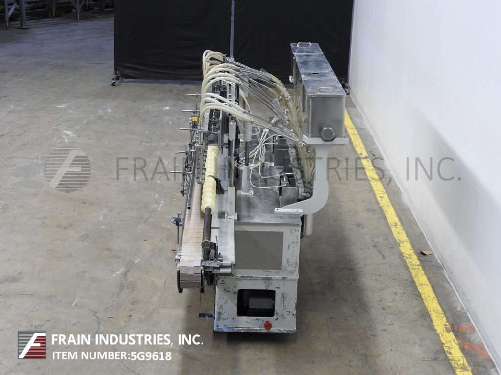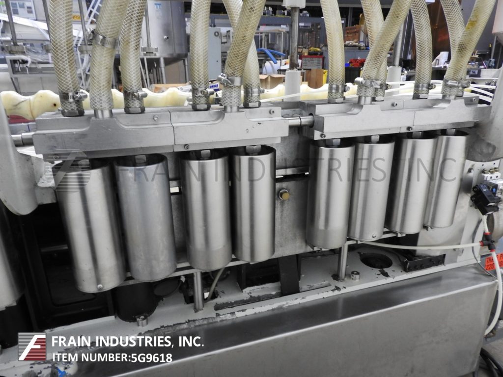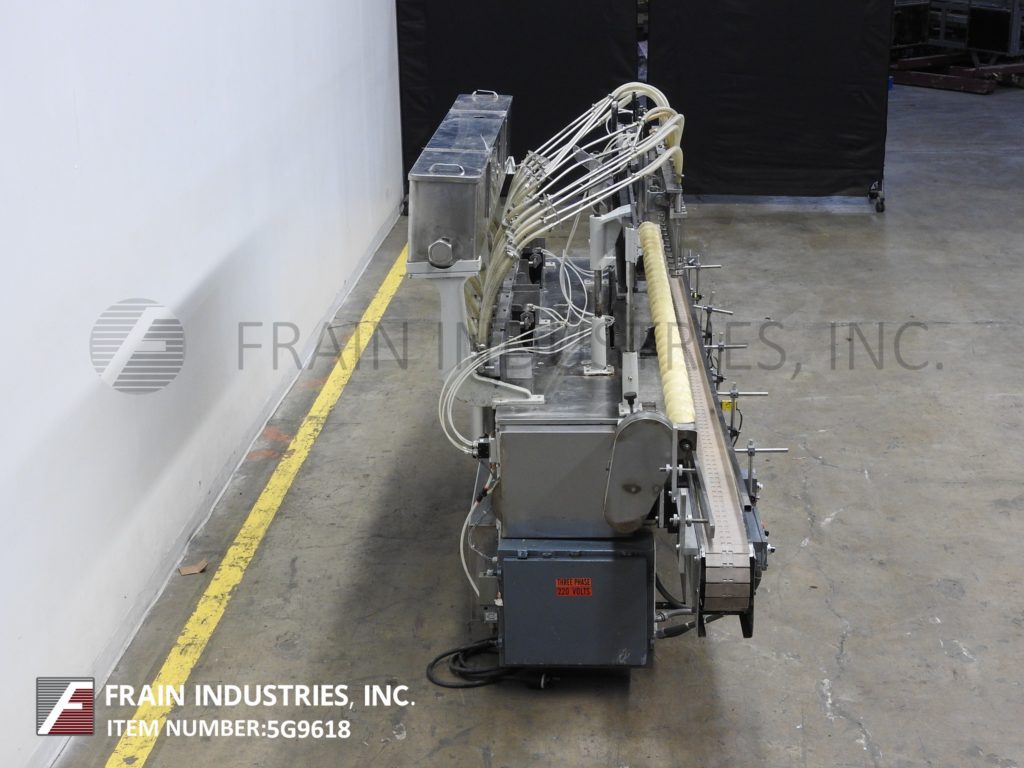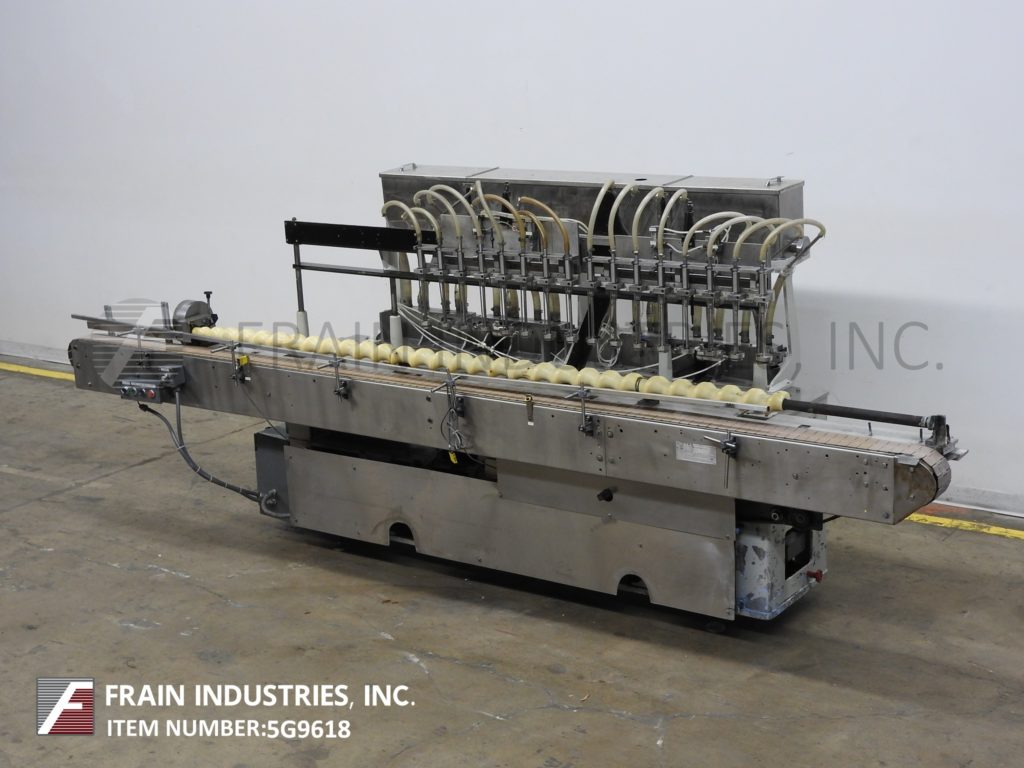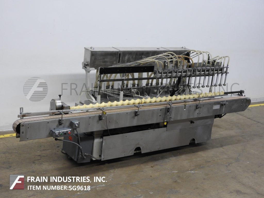 返回所有设备Cozzoli,Model LF1640,连续运动,16头在线活塞填料,每分钟16到300个容器 - 取决于材料,应用和机器配置。填充范围:最多600cc,具有适当的变化部件。配有一个168“长x4½”宽容集装箱输送机,蜗杆螺钉,目前拥有(16)35“ID x 9”长(600cc)活塞,62英寸长喷嘴滑块与(16)(7/16)“OD潜水喷嘴,带定心钟,设置在4”中心和80“长x 9”宽x 12“深层(37加仑)顶级产品罐。安装在不锈钢底座上。