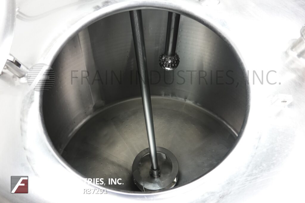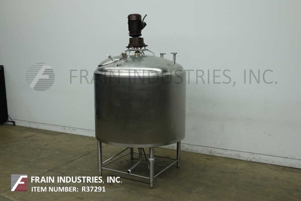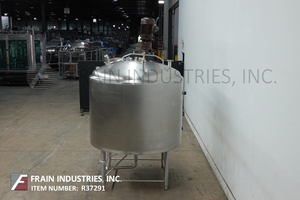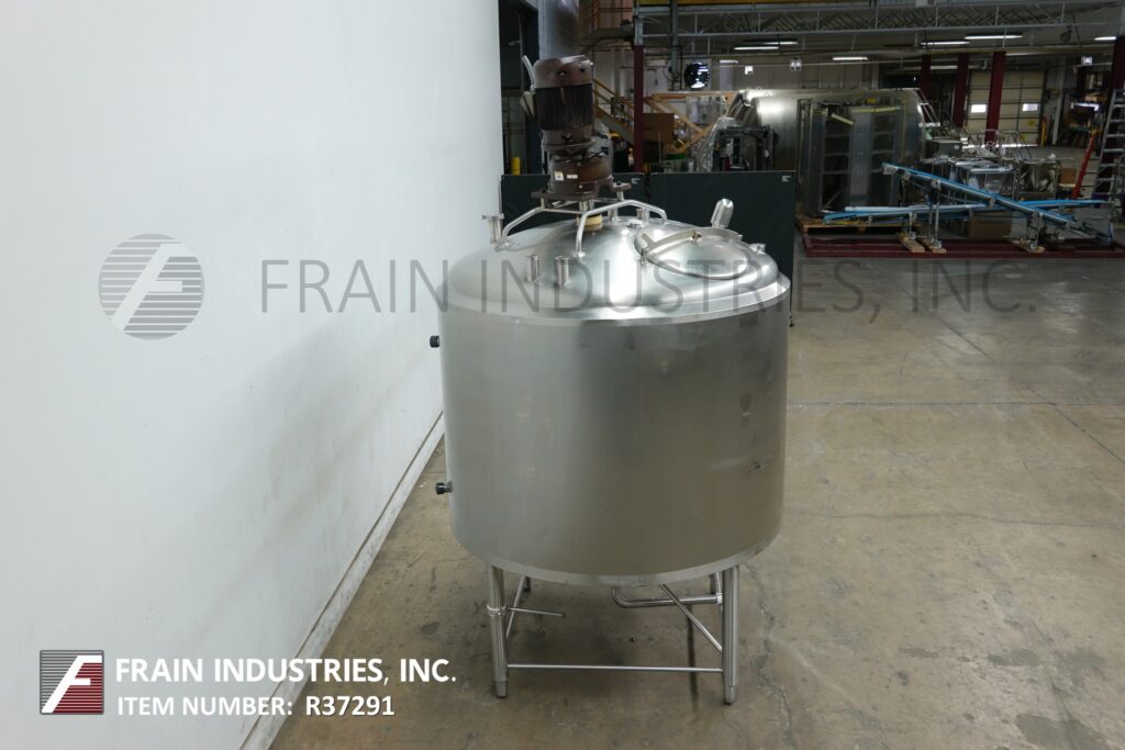Back to All EquipmentCrepaco, 700 gallon capacity, 304 Stainless Steel jacketed and insulated process tank. Vessel dimensions: 66" diameter with 48" straight wall. Equipped with lift up / clamp down cover, top mounted dixie mixer agitation and (1) CIP spray balls supplied by 2½"OD / 2"ID Tri-clamp fittings. Dish bottom has 2½" OD / 2" ID bottom discharge with 12" ground clearence.