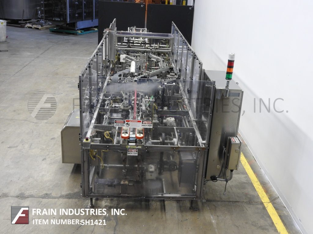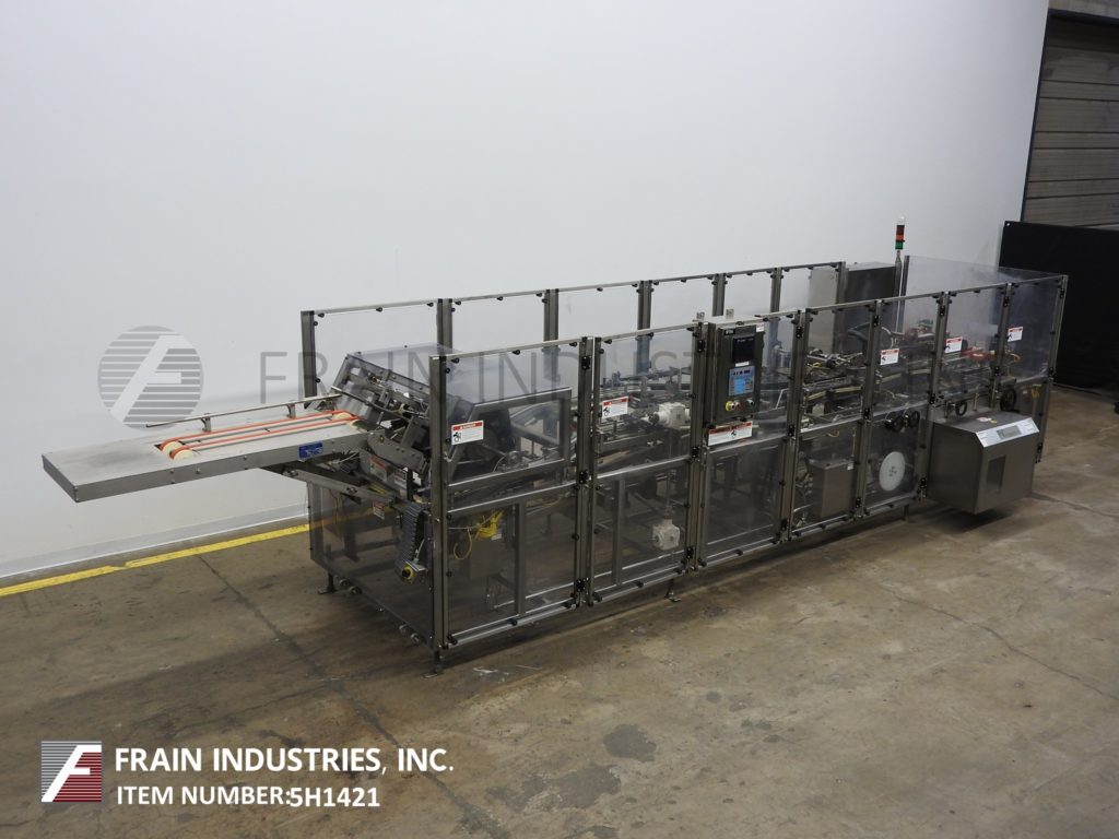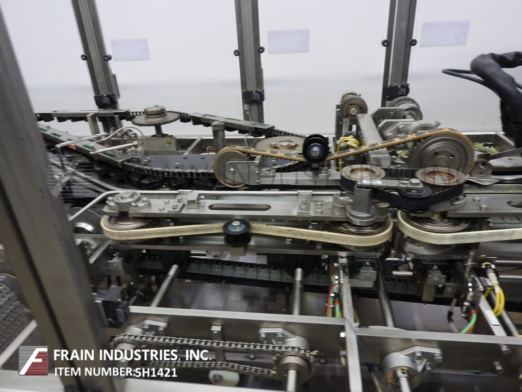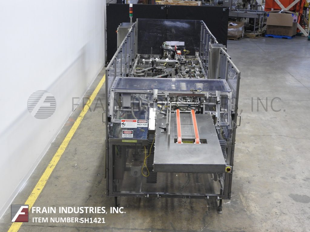 Back to All EquipmentDavis Engineering, automatic, stainless steel sleever. Rated from 50 to 140 sleeves per minute – depending on materials, application and machine configuration. Equipped with dual lane (over / under) product in feed with (2) 5" wide Intralox style belts, 110" long x 3" wide plastic delron lugged product conveyor set on 9" centers, 60" long x 12" wide powered blank carton magazine with (4) head rotary sleeve feeder, which transports sleeve blanks under product as it is being conveyed. 24" long x 1" wide overhead confining belt, sleeve flap plows, Nordson hot melt glue system, overhead belt compression section and 10" long dual side belt discharge. Control panel has an AB controller with an AB PanelView600 touch screen display. Mounted on stainless steel frame with lexan guarding.