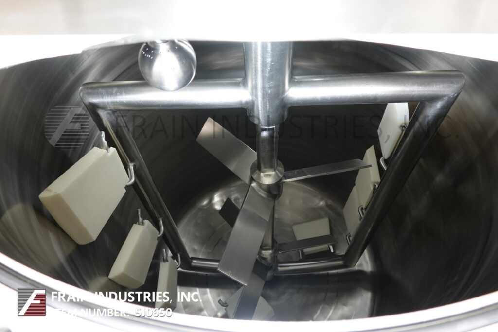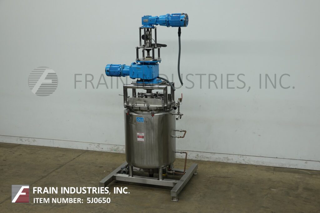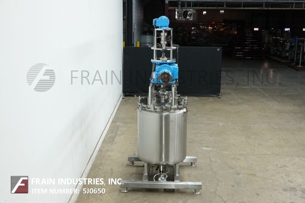Back to All EquipmentDCI, 140 gallon capacity, 316 stainless steel jacketed and insulated process tank. Vessel dimensions: 32" diameter with 40" straight wall. Equipped with lift up / bolt down covers, top mounted 3 Hp side and bottom scrape surface agitation, 3 HP prop agitation and (2) CIP spray balls supplied by 2"OD / ¾"ID Tri-clamp fittings. Dish bottom has 2½" OD / 2" ID bottom discharge with 10" ground clearence.